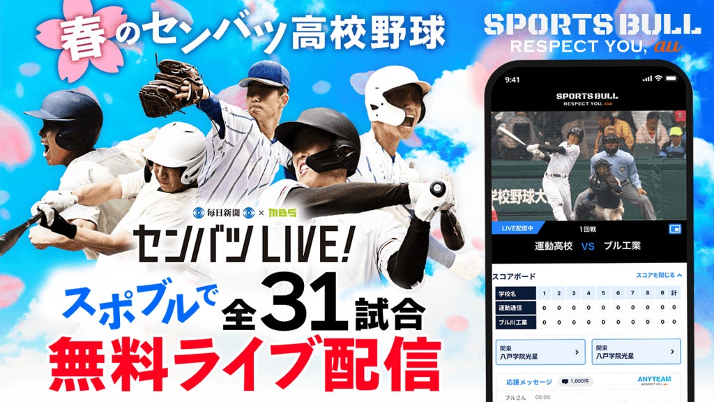 株式会社毎日新聞社(本社:東京都千代田区、代表取締役社長:松木 健、以下 毎日新聞社)、株式会社毎日放送(本社:大阪府大阪市北区、代表取締役社長:虫明 洋一、以下 MBS)、株式会社運動通信社(本社:東京都港区、代表取締役社長:黒飛 功二朗、以下 運動通信社)、KDDI株式会社(本社:東京都千代田区、代表取締役社長 CEO:髙橋 誠、以下 KDDI)は、運動通信社とKDDIが共同で運営するスポーツメディア「SPORTS BULL(スポーツブル)」内「センバツLIVE!」(https://sportsbull.jp/senbatsu/)において、2025年3月18日に開幕する第97回選抜高等学校野球大会(毎日新聞社、日本高等学校野球連盟主催、以下 センバツ高校野球)の全31試合を無料ライブ配信します。