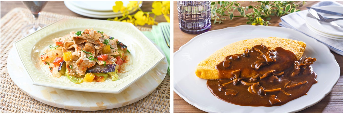 右:ふんわりしたオムレツにきのこの旨味たっぷりのデミグラスソース。お子様も大好きな味をお腹いっぱい召し上がれ!