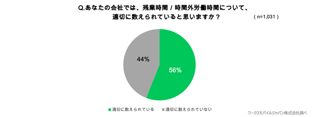 「残業時間が適切に数えられていない」と感じている人が44%を占め、残業時間管理に課題が残る結果に。