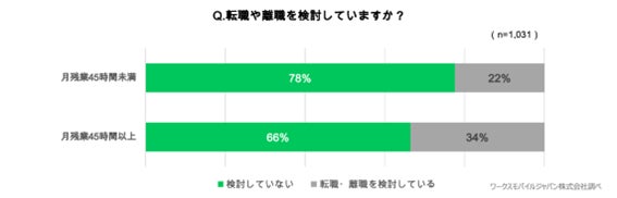 残業時間月45時間以上の人の、転職・離職意向は約3割と、月45時間未満の人に比べて10ポイントも高い。