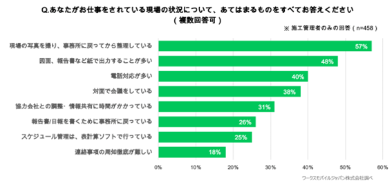 建設現場の作業では、「写真整理を事務所に戻ってから実施」、「紙出力が多い」、「電話対応が多いがあてはまる」と施工管理者の4割以上が回答。アナログな状況・手段で働いている事が明らかに。