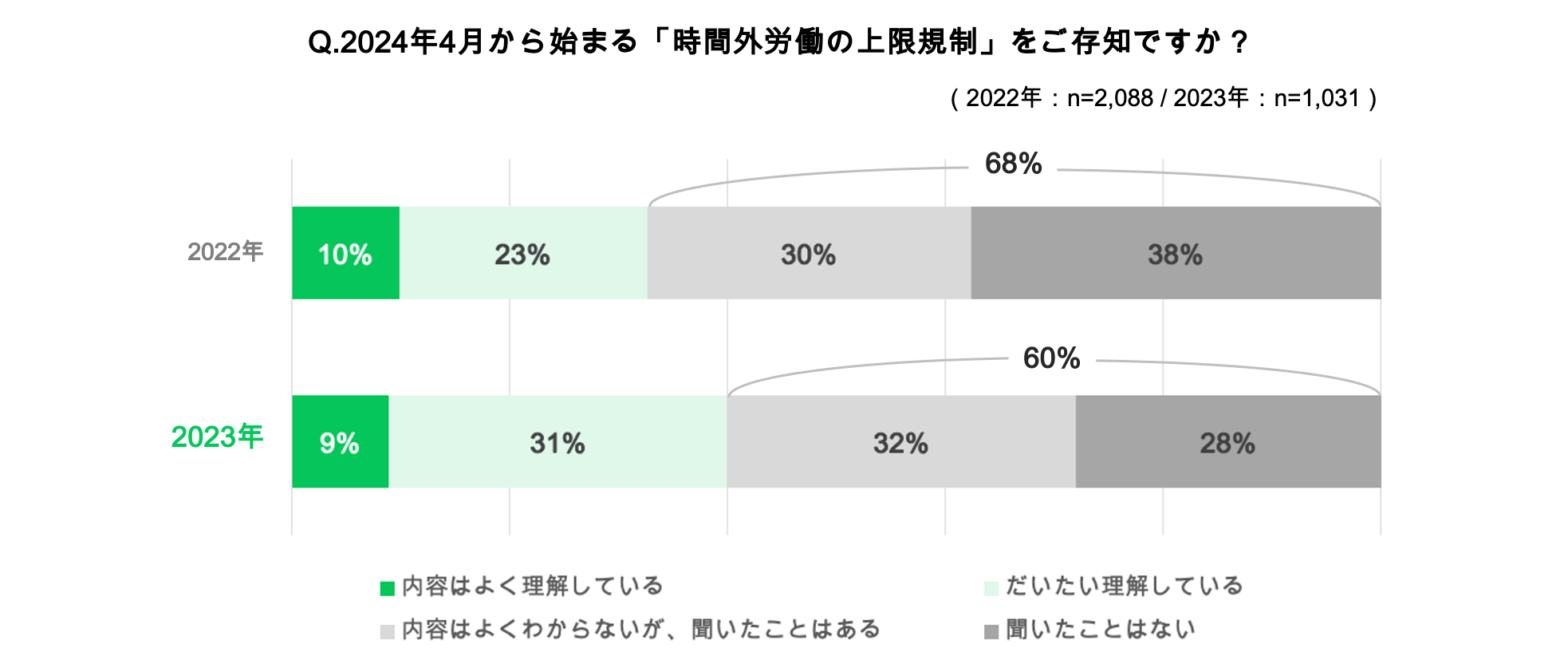 1. 2024年4月から適用される残業の上限規制について、昨年(68%)より8ポイント改善したものの、「わからない・聞いたことがない」という建設業従事者は6割を占めている。