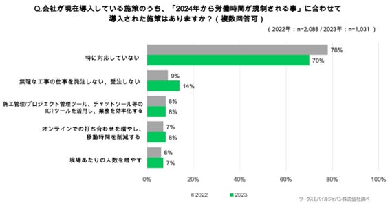 昨年に引き続き※2、他産業に比べて慢性的に働く時間・日数が長い・多いと言われる建設業の現場で働く人(施工管理者、現場作業者)に、2024年4月から適用される残業の上限規制について知っているか聞いたところ、昨年調査より改善したものの、「わからない・聞いたことがない」と回答した方は6割の結果に。また、残業の上限規制への対応については、「特に何も対応していない」が7割を占める。