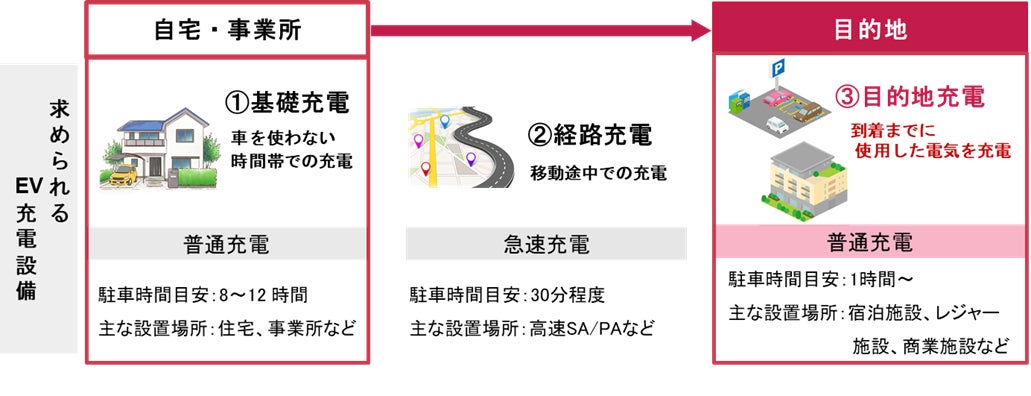 EV充電のタイプは、夜間に自宅などで充電を行う「基礎充電」、移動途中に高速道路のサービスエリアなどで急速で充電を行う「経路充電」、外出先で継ぎ足し充電を行う「目的地充電」に分けられます。本協業では、主に旅行時に宿泊先で充電することができる、「目的地充電」のための充電器を設置拡大することを目指します。