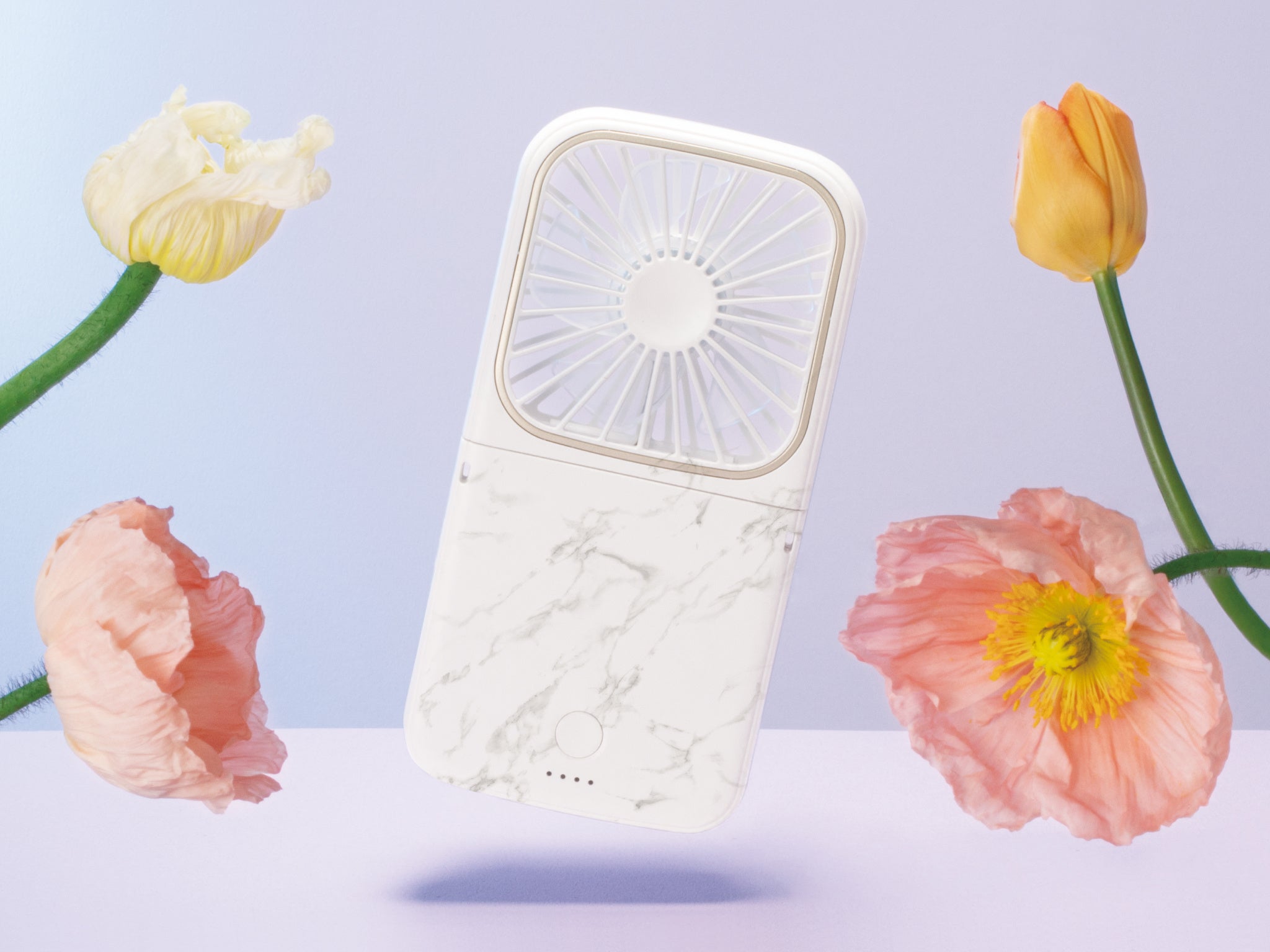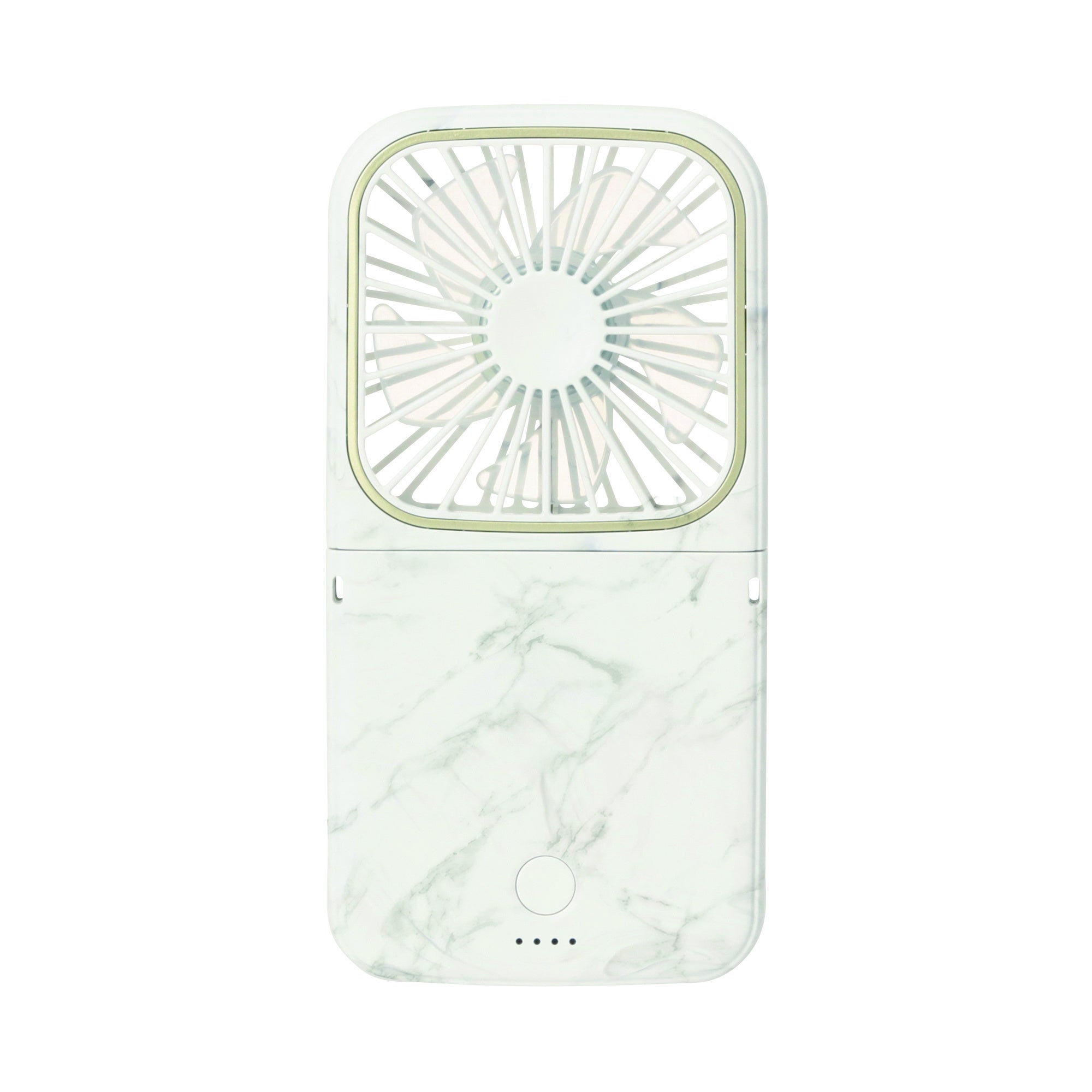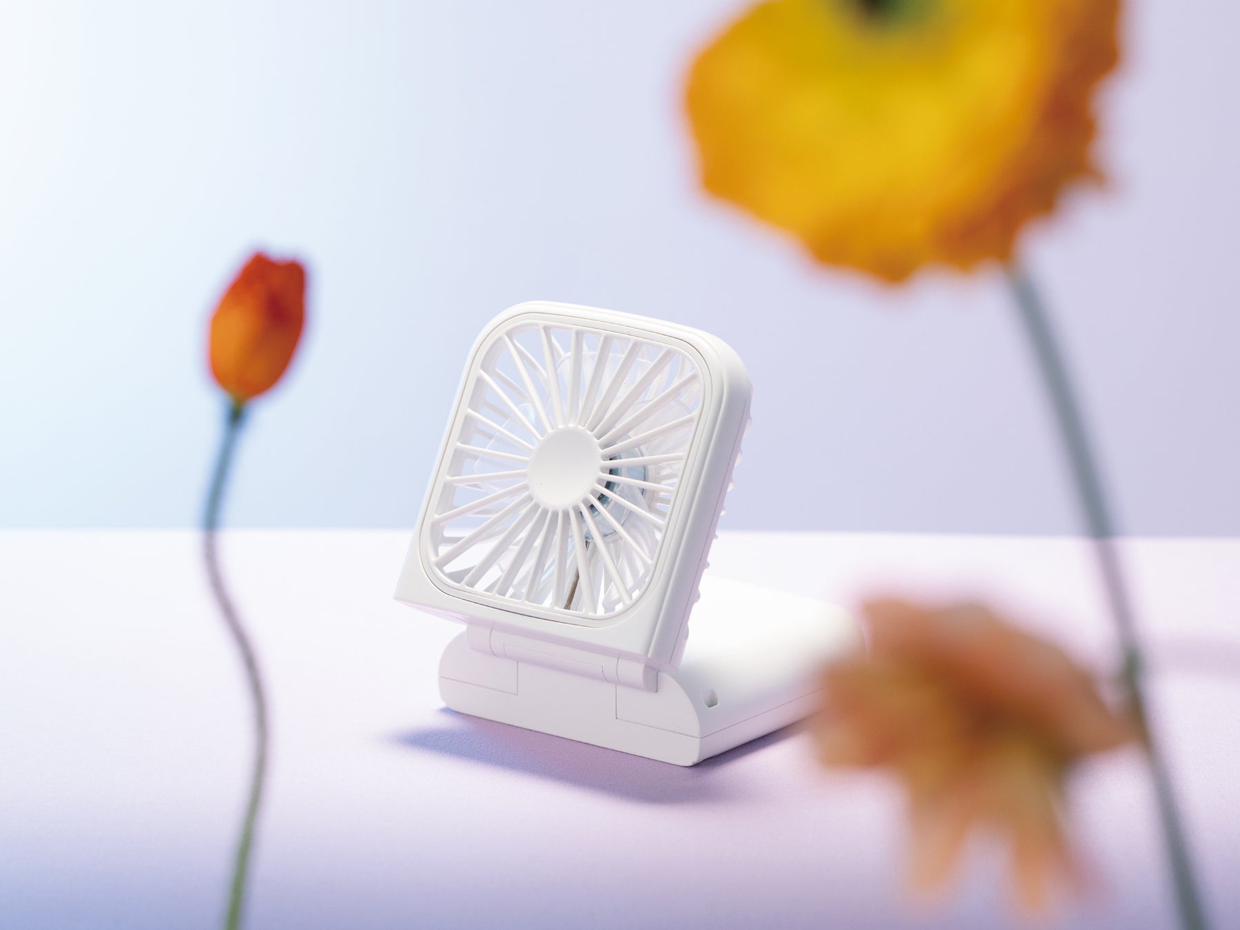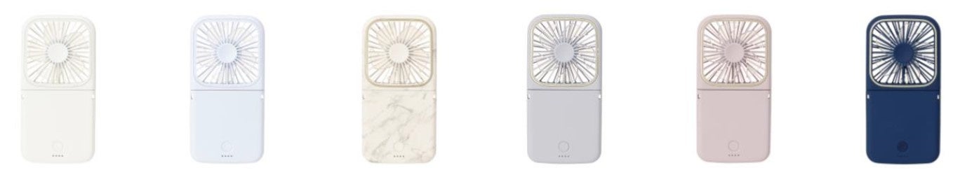 一見、ハンディファンには見えないスマートフォンのようなフォルムは、女性も片手で扱いやすいようサイズだけでなく重量や薄さまで追求し、使っている姿をイメージしながら開発したこだわりのスマートなデザインです。シンプルでどんなファッションにも合わせやすいホワイトとライトブルー、大理石のようなマーブルにゴールドが光るエレガントなマーブルホワイト、さらさらしっとりの質感と柔らかい風合いにこだわったマット加工が高級感を演出するマットグレー、マットピンク、マットネイビーの世代を問わずファッショナブルに持ち歩くことができるデザインの全6色をラインアップしました。本体をおよそ半分のサイズに折りたたむことができるので、小さなバッグの中でも邪魔にならずコンパクトに持ち運ぶことができます。また、無段階調整可能なので好みの角度に調整し、デスクファンとしても活躍します。