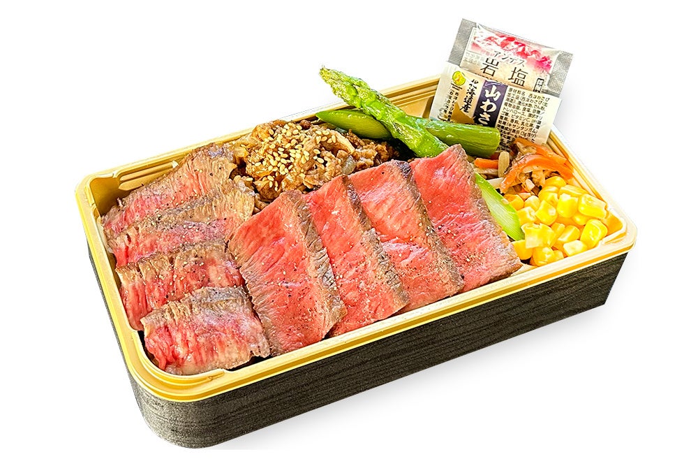 札幌市にあるステーキ専門店「札幌ステーキ毘沙門」が初出店。口どけの良い脂身が特徴の「ふらの和牛」の内もも、ロース、切り落としと3種類の部位が楽しめるお弁当です。塩と山わさびであっさりと味わいます。
