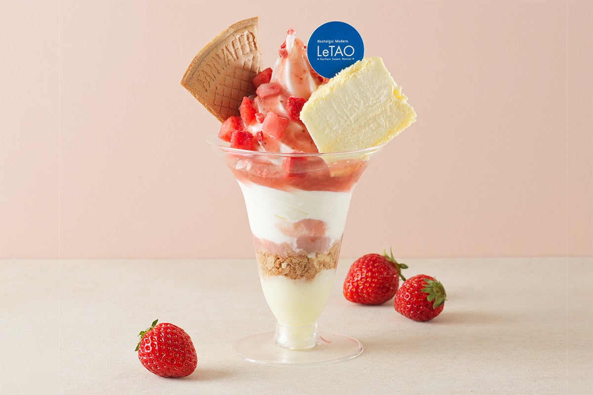 ミルクプリンに香ばしいフィアンティーヌといちごのダイスソースを乗せ、ミルクソフトを重ねた「小樽洋菓子舗 ルタオ」のパフェ。定番のドゥーブルフロマージュをトッピングし、いちごの甘酸っぱさとミルキーな味わいが調和した春らしい一品です。