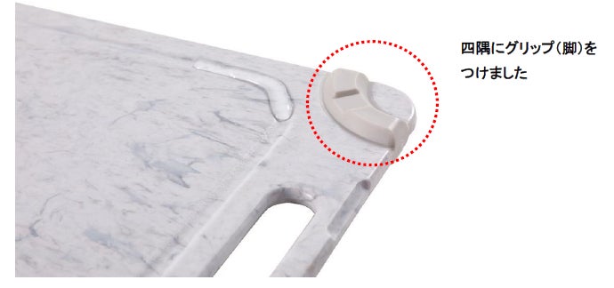 今回DCMは裏面が調理台に直接接地しないように四隅にグリップ(脚)をつけた「DCM 裏がつかないまな板」を新発売します。まな板を調理台から浮かすことで、調理中に片面が汚れても洗わずに裏返してすぐ使うことができるので、調理時間を短縮できることが特徴です。