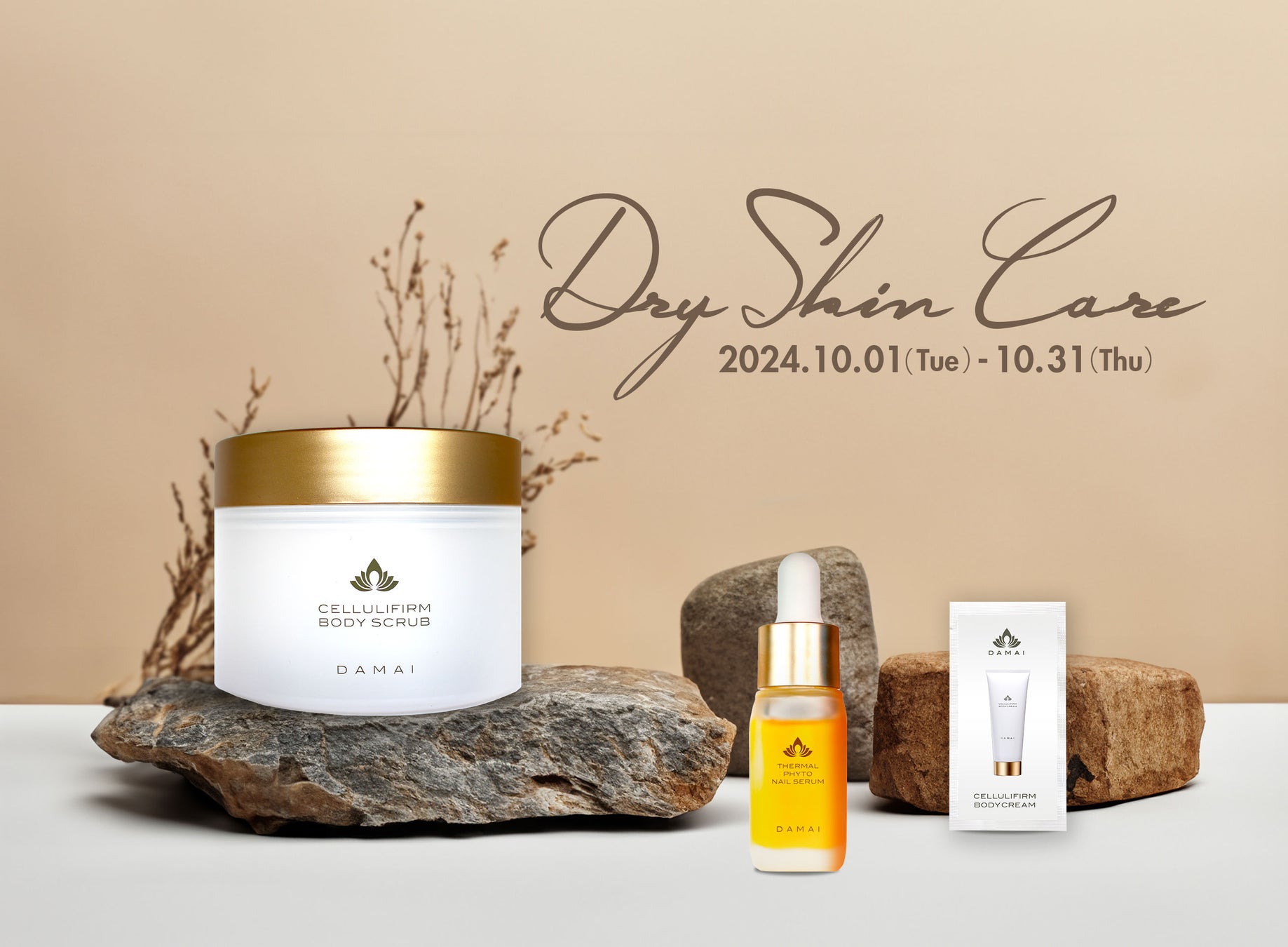 株式会社シティコミュニケーションズ(本社 :横浜市神奈川区 代表取締役社⻑:三田 大明)が運営する代官山のスパ「SPA DAMAI(以下、「ダマイ」)」の公式オンラインストアにて、2024年10月1日から10月31日までの期間、秋の乾燥対策推奨キャンペーンを実施いたします。当キャンペーンでは、全身+足先手先まで、保湿だけでなく温めやエイジングケア*も期待ができるこの時期ピッタリの「ダマイ」のボディスクラブとネイルセラムがお得に手に入る『Dry Skin Care』セットとして14,000円(税込)で販売いたします。