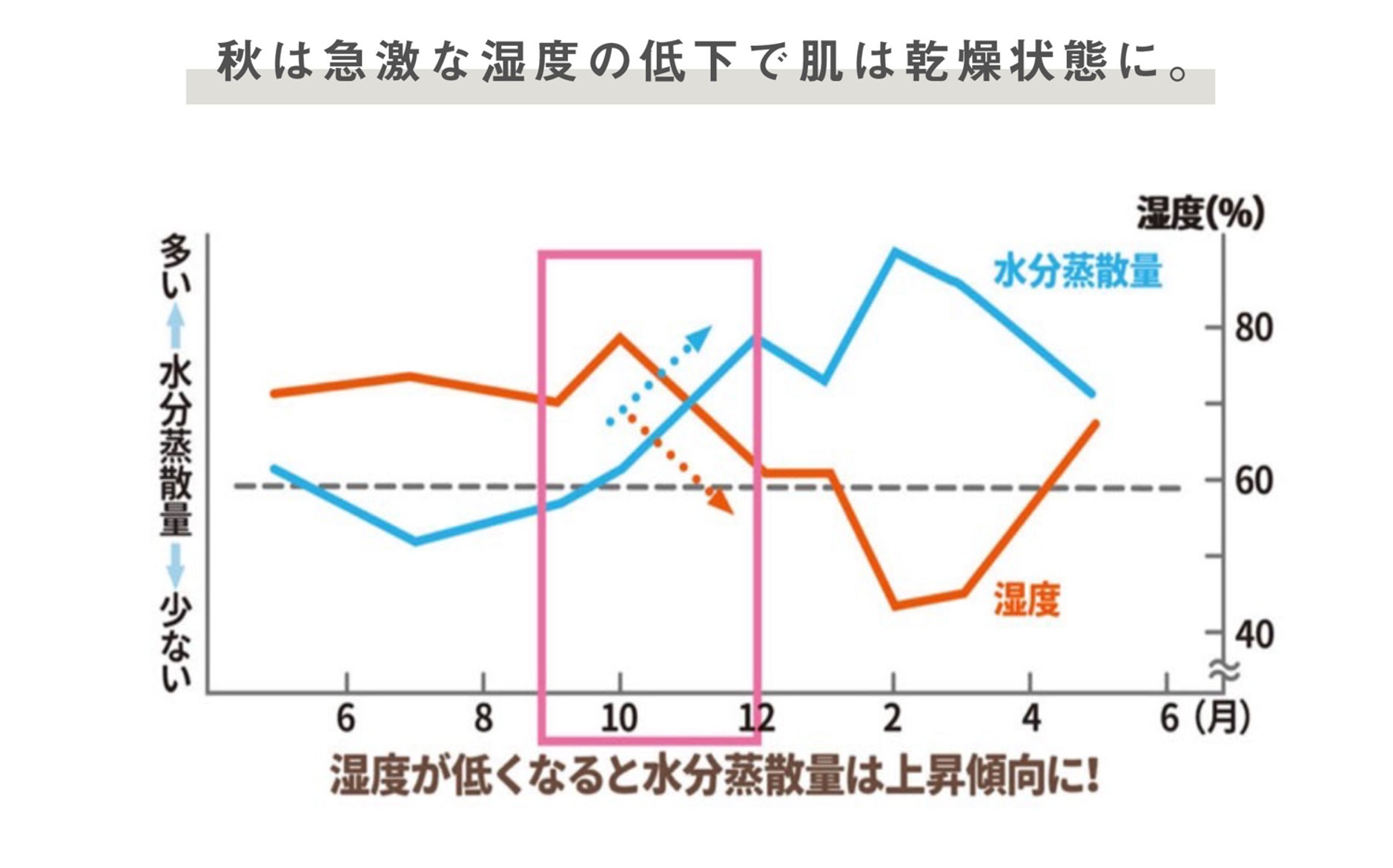 寒暖差が非常に大きいこの時期、湿度の低下によりお肌は乾燥傾向に。湿度が低くなるとお肌の水分蒸散量は上昇傾向にあると言われています。また、夏に受けた紫外線ダメージによるお肌のバリア機能低下も懸念されます。半袖から長袖へ、肌をあらわにする機会は減っていく分、洋服がお肌に刺激を与える機会は増えていきます。秋のおしゃれ着の繊維とお肌の摩擦により、お肌の水分は奪われるという事も。夏に蓄積された肌ストレスの払拭、さらにこれからの気候への備えとして、乾燥対策はマストと言えます。