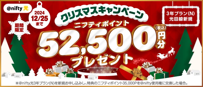 ニフティ、「@nifty光 3年プラン(N)」の新規申込で最大52,500円分(税込)のニフティポイントをプレゼントする「クリスマスキャンペーン」を実施