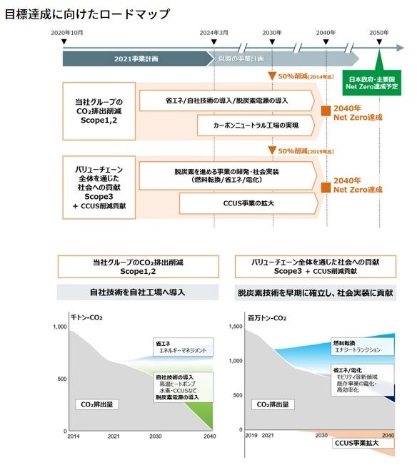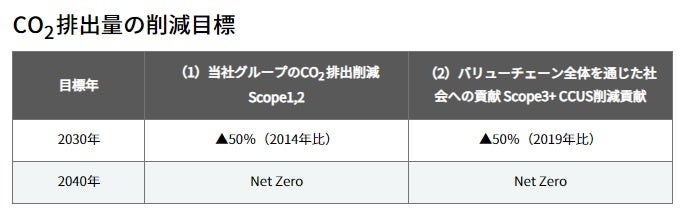 2020年10月に発表した中期経営計画である「2021事業計画」において、エネルギー供給側で脱炭素化を目指す「エナジートランジション」と、エネルギー需要側で脱炭素・省エネ・省人化を実現する「モビリティ等の新領域」を2つの成長領域に定めました。これら領域の事業を推進し、また既存事業の脱炭素化・電化・知能化を推進することにより、2040年のNet Zeroを実現すべく、「2040年カーボンニュートラル」を宣言し、2つの新たな目標を策定しています。