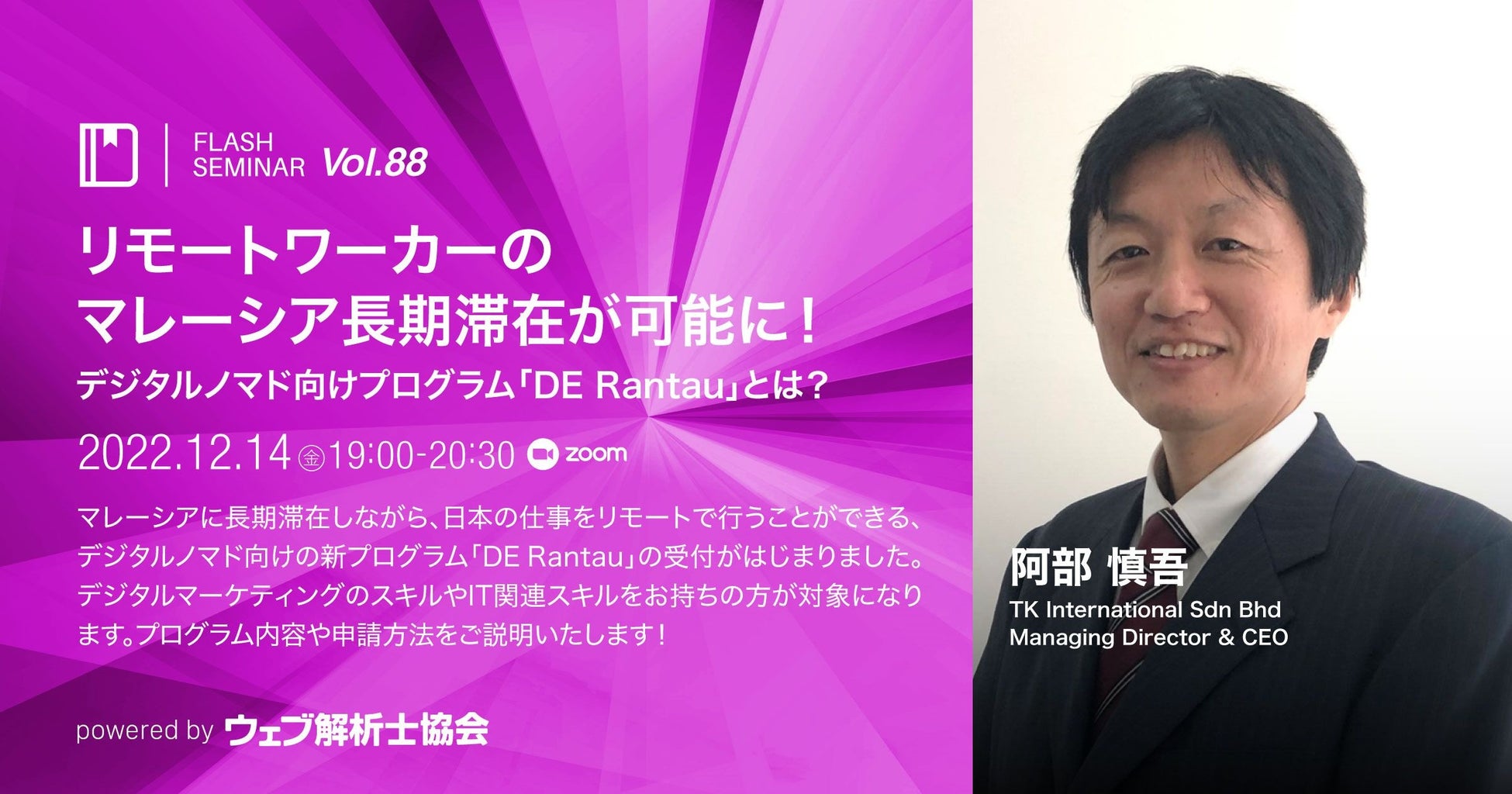 2022/12/14(水)19:00 - 20:30【Flashセミナー】 Vol.88【無料】リモートワーカーのマレーシア長期滞在が可能に!デジタルノマド向けプログラム「DE Rantau」とは?