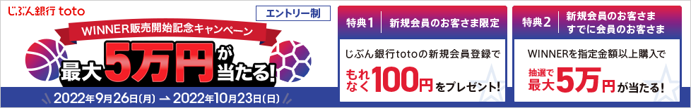 本キャンペーンでは、対象のスポーツくじ「WINNER」を購入されたじぶん銀行toto会員すべてのお客さまを対象に、購入金額に応じて、抽せんで最大現金5万円をプレゼントします。また、キャンペーン期間中にじぶん銀行totoに新規会員登録されたお客さまに、もれなく現金100円をプレゼントします。