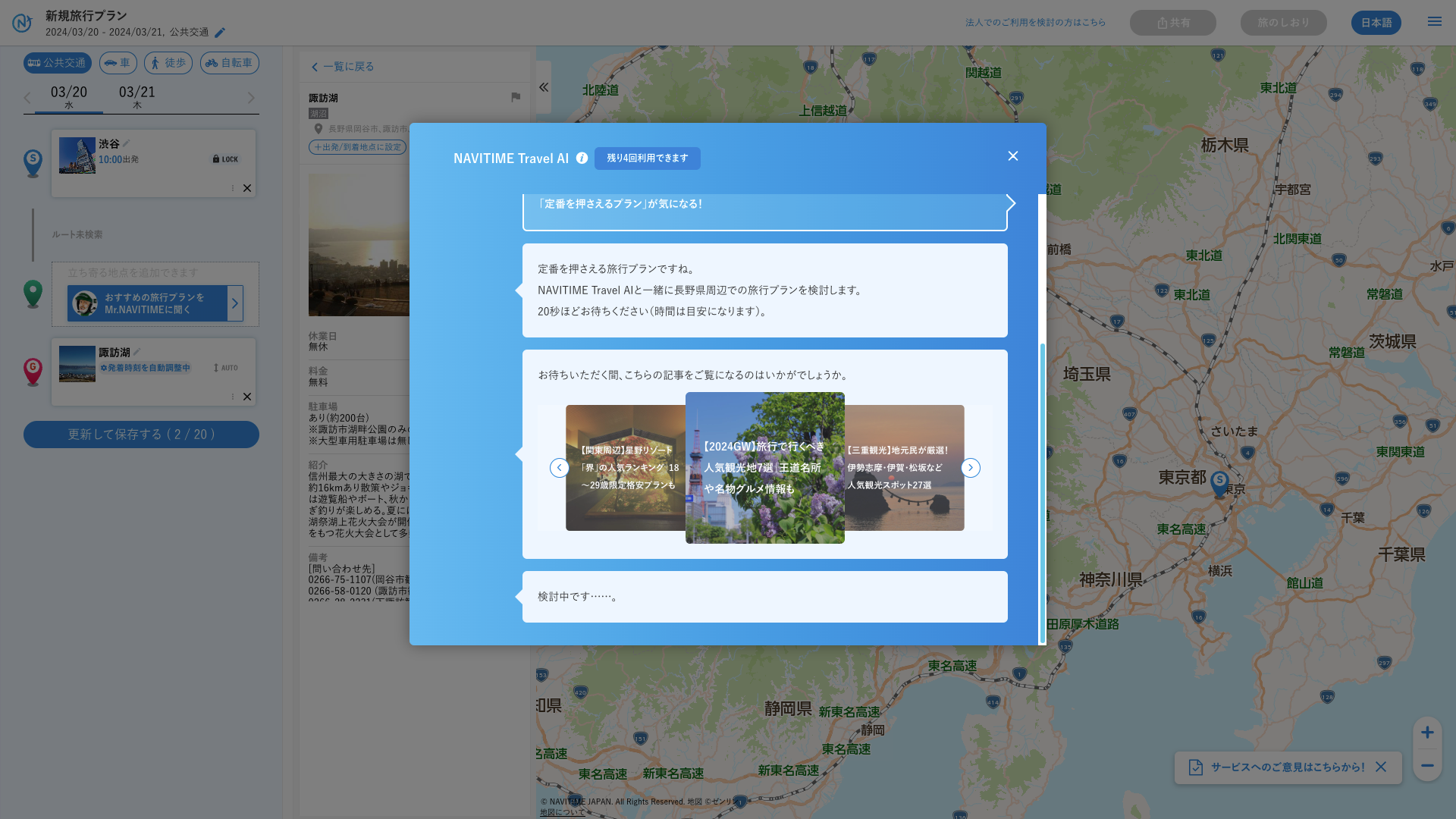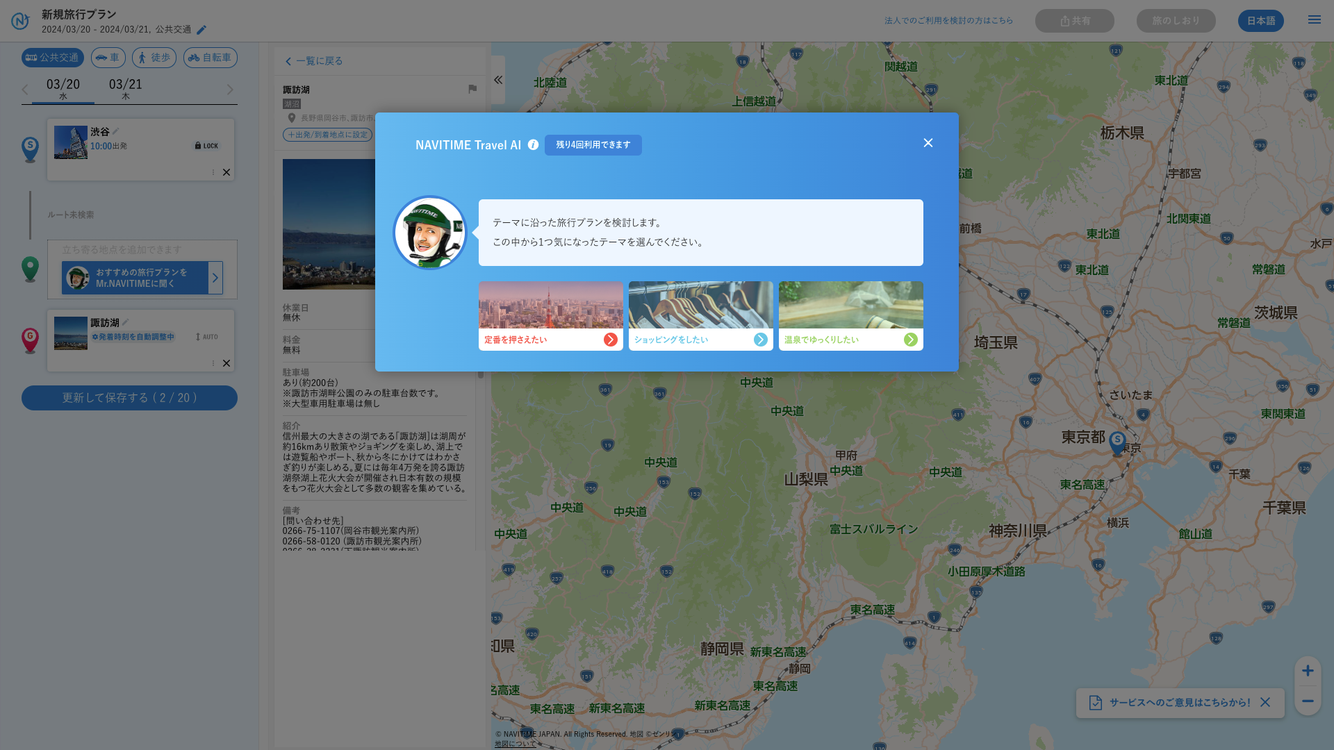 例えば、出発地点に渋谷(東京)、目的地点に諏訪湖(長野)を設定して、「おすすめの旅行プランをMr.NAVITIMEに聞く」ボタンをクリックし、「テーマ:観光名所を巡りたい」を選択すると、生成AIが、途中で立ち寄れるおすすめの観光スポットと旅行プランを提案してくれます。