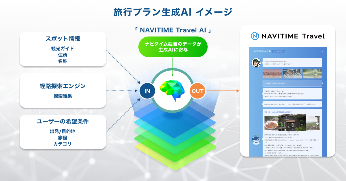 ナビタイムジャパンの独自整備によるスポットデータや観光コンテンツといった情報資産や、複数地点の巡回経路探索の技術資産と、生成 AI を活用すること(ナビタイムの観光データ・経路探索エンジン×生成AI)により、実現しています。
