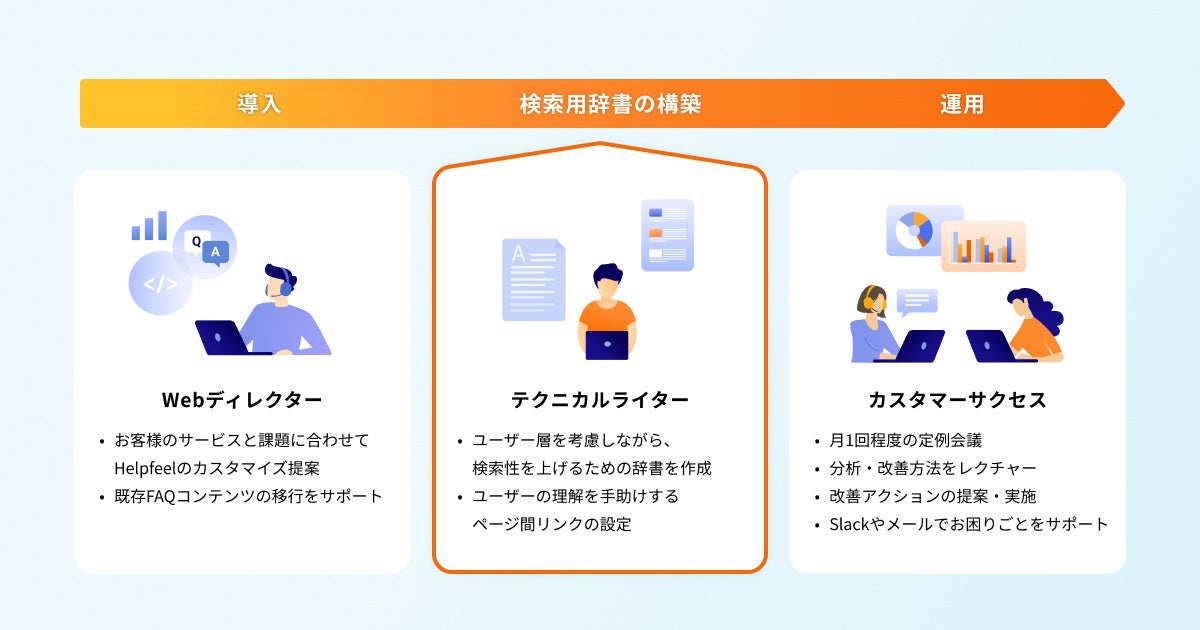 当社ではFAQの検索システム「Helpfeel(ヘルプフィール)」の初期構築時においてテクニカルライターが、コンテンツを編集し読みやすくするだけでなく、質問文を作りFAQ検索にヒットしやすいようチューニングすることで、エンドユーザーの自己解決を促進するサービスを提供しています。