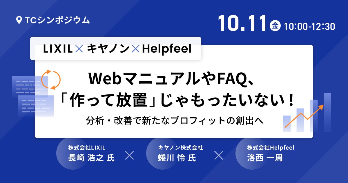 株式会社Helpfeel(京都府京都市、代表取締役/CEO:洛西 一周、以下「当社」)は、一般財団法人テクニカルコミュニケーター協会(JTCA)主催の「TCシンポジウム2024」(2024年10月9日〜11日)にて、当社CEOの洛西がパネルディスカッションに登壇することをお知らせいたします。株式会社LIXILおよびキヤノン株式会社と共に、「WebマニュアルやFAQの分析・改善による新たなプロフィットの創出」をテーマに実例を交えたパネルディスカッションを行います。