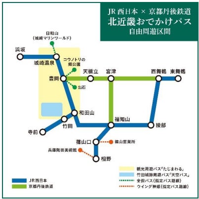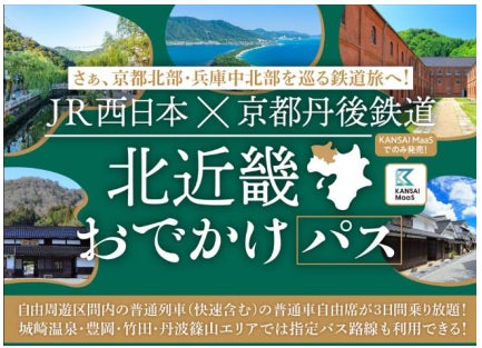 西日本旅客鉄道株式会社(以下、JR西日本)、京都丹後鉄道を運行するWILLER TRAINS株式会社(以下、京都丹後鉄道)、全但バス株式会社(以下、全但バス)、株式会社ウイング神姫(以下、ウイング神姫)は、大阪・関西万博開催期間中を含め、京都北部や兵庫中北部へのご旅行に便利なデジタル周遊パス「JR西日本×京都丹後鉄道 北近畿おでかけパス」を「KANSAI MaaS」にて発売いたします。