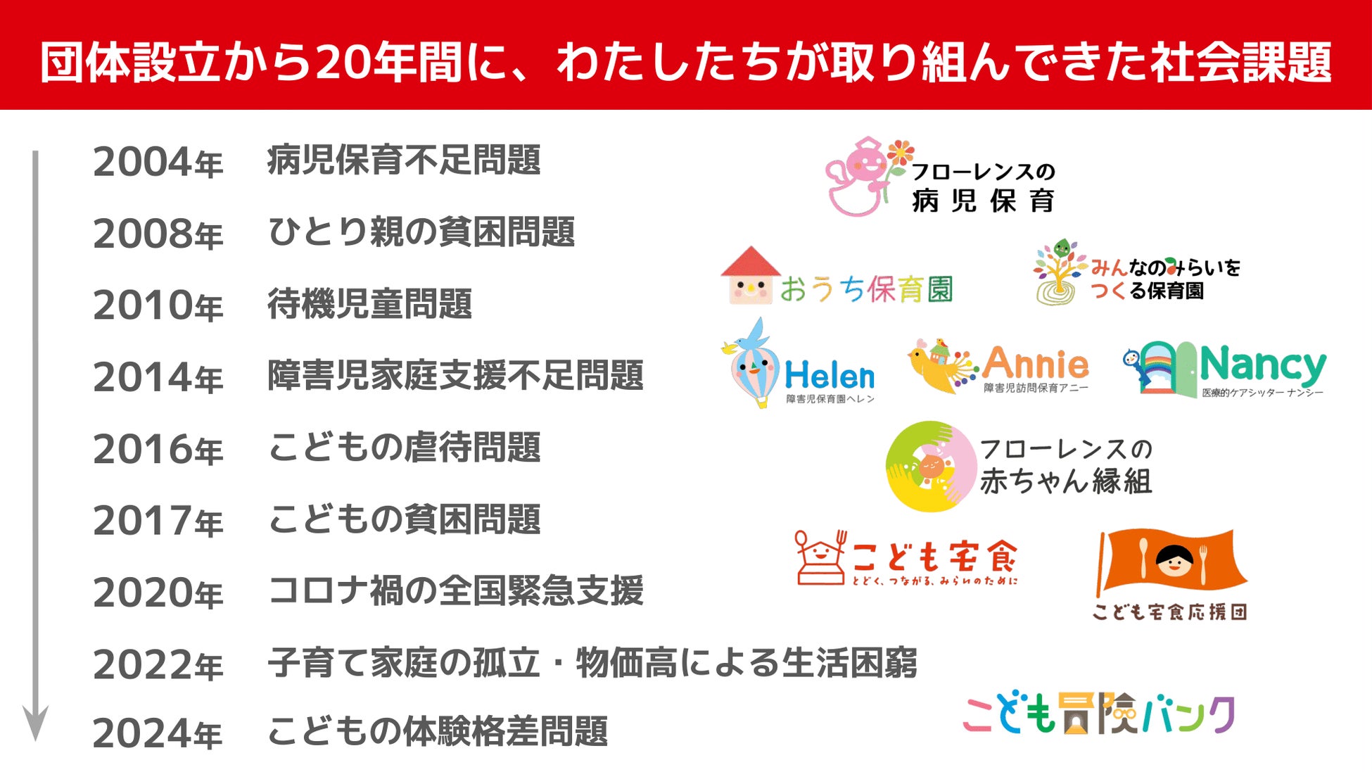 2015年度に「小規模認可保育所」として国策化された「おうち保育園」をはじめとする保育事業、障害児家庭に保育や支援を届ける「フローレンスの障害児保育・支援」、こどもの虐待問題解決のため「フローレンスのにんしん相談・赤ちゃん縁組」、こどもの貧困を解決する「こども宅食」などの取り組みを全国に広め、たくさんの仲間と共に、社会に「新しいあたりまえ」をつくることを目指しています。