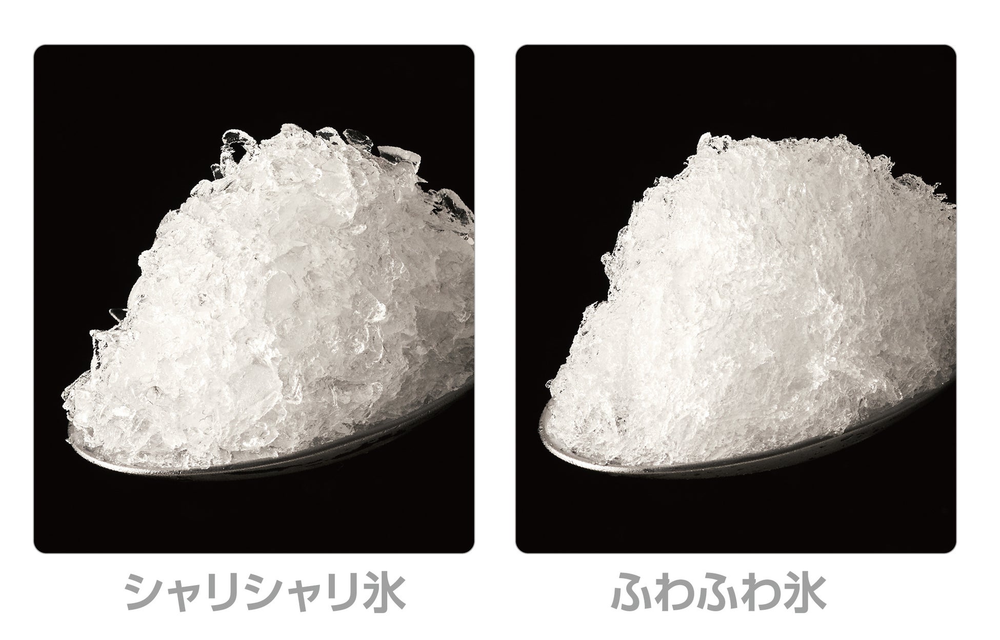刃の高さ調節ネジで、氷の粗さを調整でき、食感のあるシャリシャリ氷から、ふわっとしたふわふわ氷を楽しむことができます。シャリシャリ食感は主にドリンクに使用する時に合う食感で、ふわふわ食感は料理やそのままかき氷として楽しむ時に適した食感となっています。