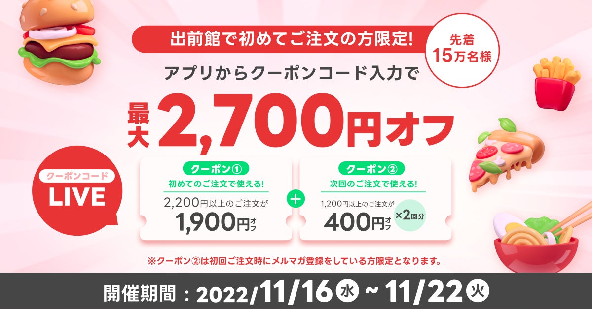 ・コラボ記念クーポン(「出前館」の1,001円以上の注文で使える1,000円OFFクーポン)