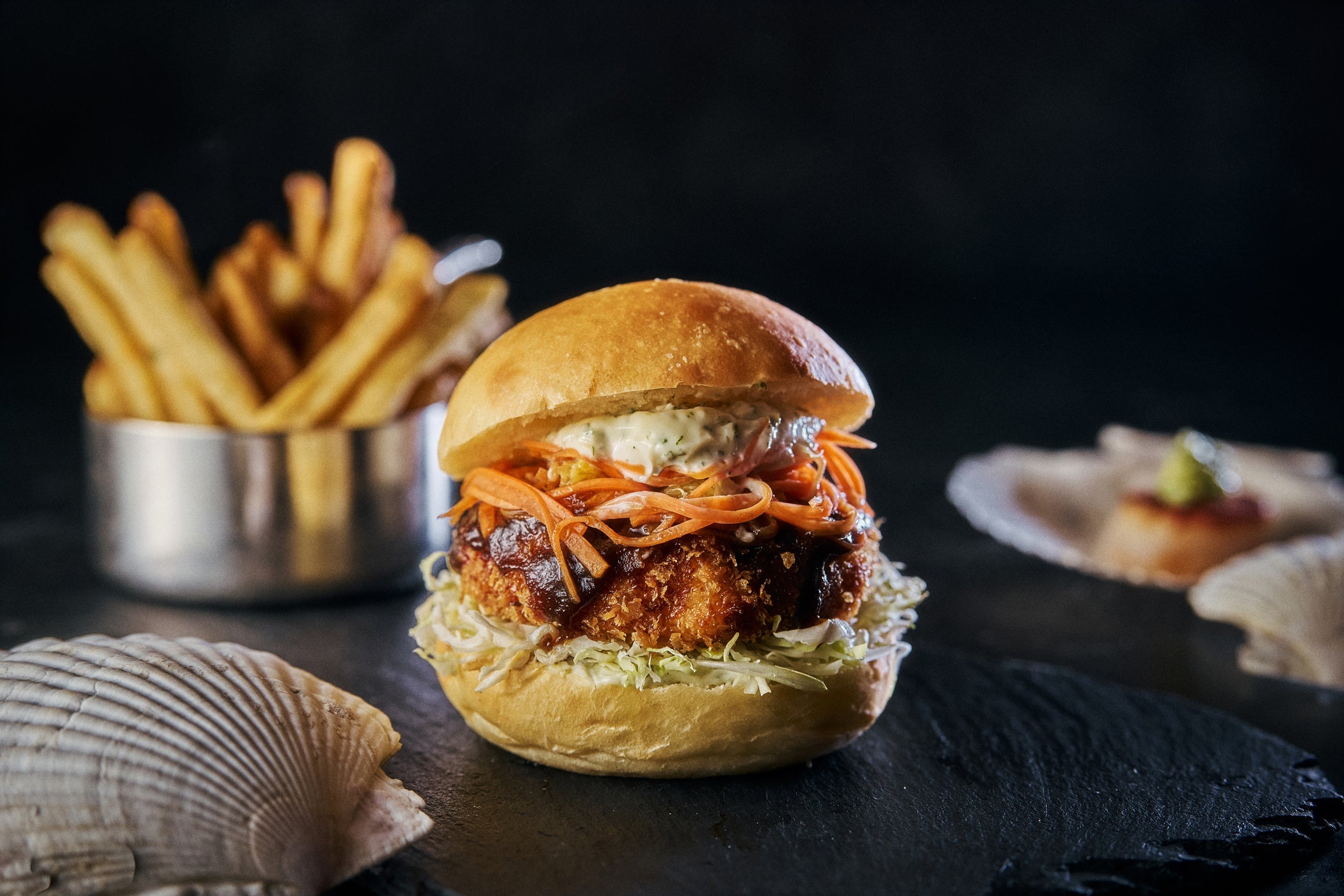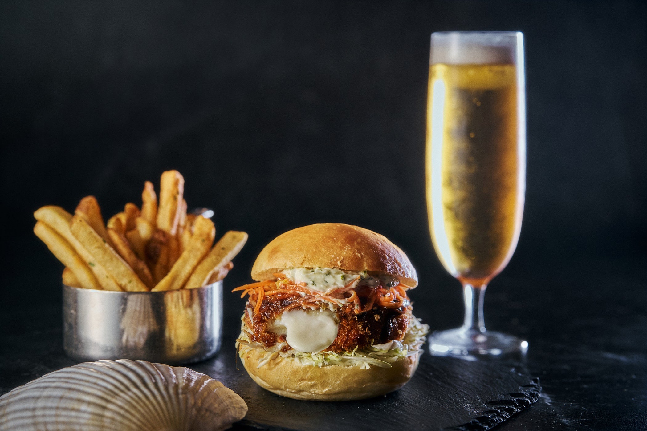 新鮮な素材をダイナミックに調理するステーキハウス「オーク ドア」では、開業時から変わらないレシピで愛され続けている帆立貝のグリルに着想を得た熱々のグルメバーガーが登場いたします。メインとなるのは、バターでソテーし、ほぐした帆立をチーズやクリームでつくる濃厚なベシャメルソースと絡めて揚げる濃厚なグラタンクロケット。このサクサクの特製クロケットを豪快にホテルメイドのポテトバンズでサンドします。味付けには、甘味と旨味のバランスのいい自家製ウスターソースや、ガーリックが食欲をそそる自家製ハーブアイオリをトッピング。また、一緒にサンドするサボイキャベツや細かく刻んだにんじんの甘味とさまざまな食感もお楽しみいただけます。ビールとの相性抜群のグルメバーガーをご堪能ください。