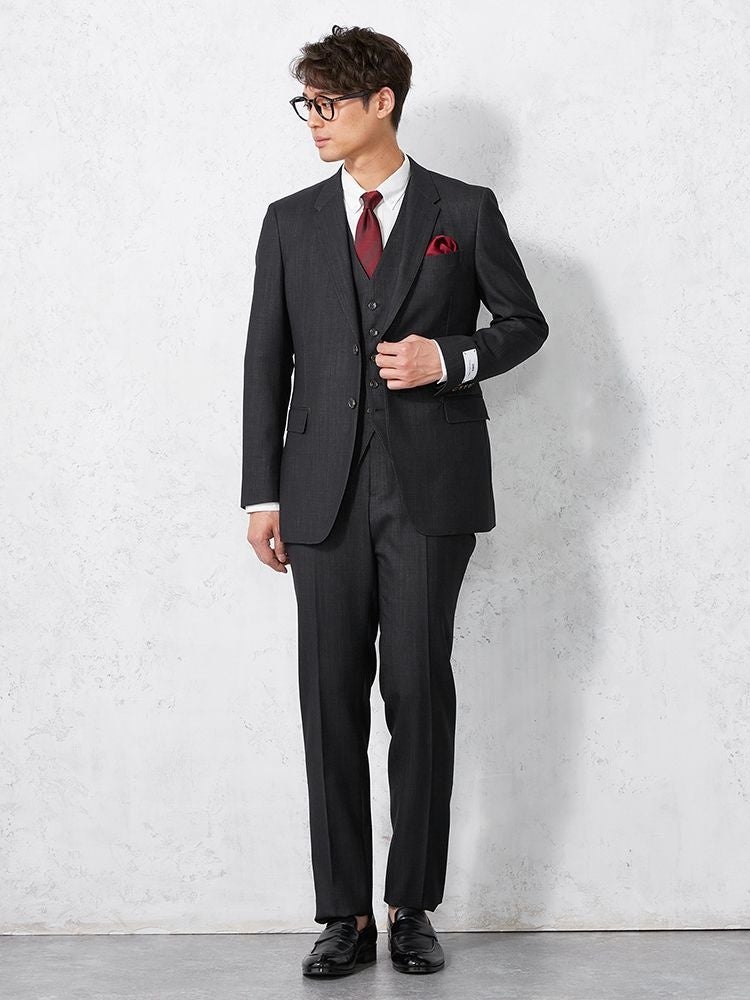 フォーマルな印象を演出する高級感がある上品な光沢のスーツです。華やかなシーンにマッチします。ベスト付きで着回し力もある一着です。さらに2月には新色のブラウンの展開を予定しています。
