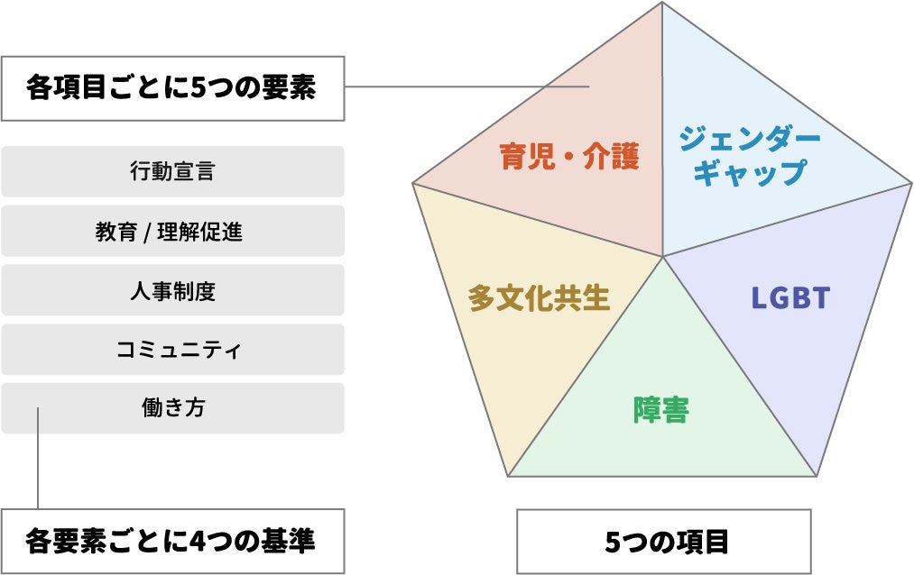 本アワードは、ダイバーシティ&インクルージョンに取り組む企業を独自の指標「ダイバーシティスコア」で採点し、点数に応じて評価する認定制度です。ジェンダーギャップ、LGBT、障がい、多文化共生、育児・介護の5つの観点から構成された計100項目のスコアをもとに、ビギナー(認定スコア1〜20点)、スタンダード(認定スコア21〜60点)、アドバンス(認定スコア61〜80点)、ベストワークプレイス(認定スコア81〜100点)が認定されます。