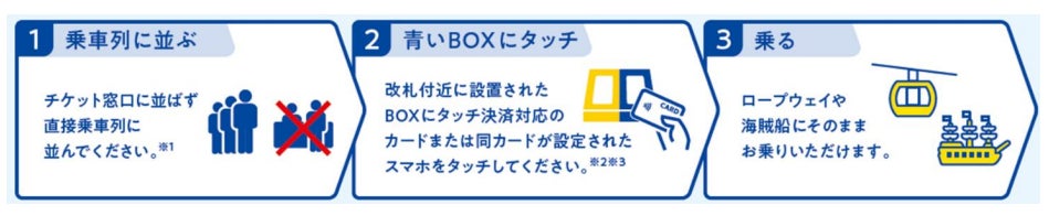 ※2:タッチ決済は、ご利用運賃分の精算ではなく、1日乗り放題乗車券・乗船券として取り扱われます。当日初回のタッチでロープウェイでは2,500円が、海賊船では2,220円がご利用額として認証され、当日中であれば2回目以降のタッチによるお支払いは発生しません(ご乗車(乗船)にはタッチが必要です)。なお、タッチ決済ご利用後の払い戻しは出来ません。