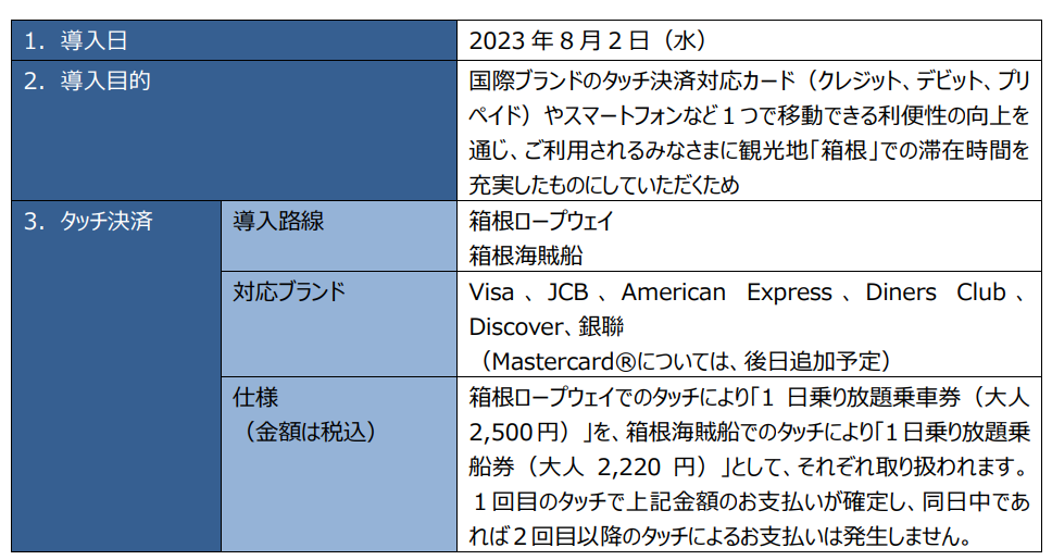 全国初 ロープウェイに国際ブランドのタッチ決済を導入8月2日、箱根エリアの交通網に国際ブランドのタッチ決済、QR認証を導入