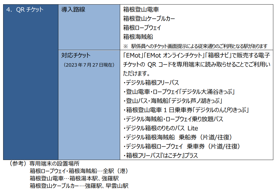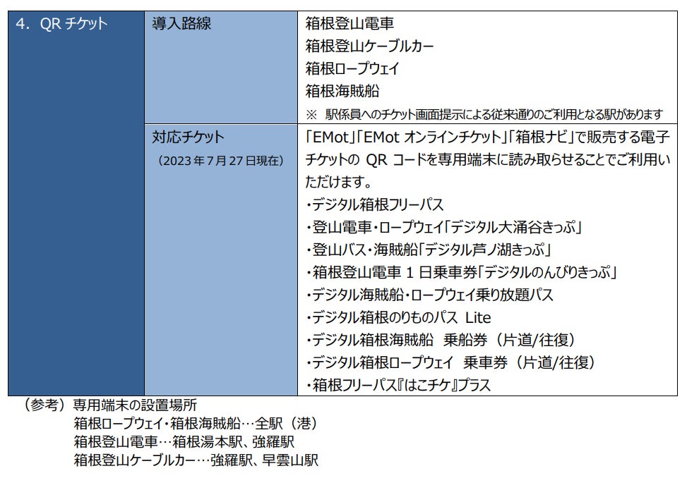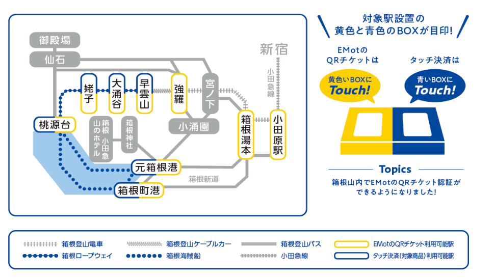 箱根ロープウェイと箱根海賊船に導入するタッチ決済は、往復利用いただくことの多い訪日旅行者の傾向を捉え、タッチにより1日乗り放題乗車(船)券として取り扱われます。利用の都度精算するよりもお得に、利便性高くご利用いただけます。QRチケットは、箱根登山電車と箱根登山ケーブルカーにも導入し、箱根山内広域でご利用いただけることから、お客さまに便利でスムーズな旅の時間を提供します。