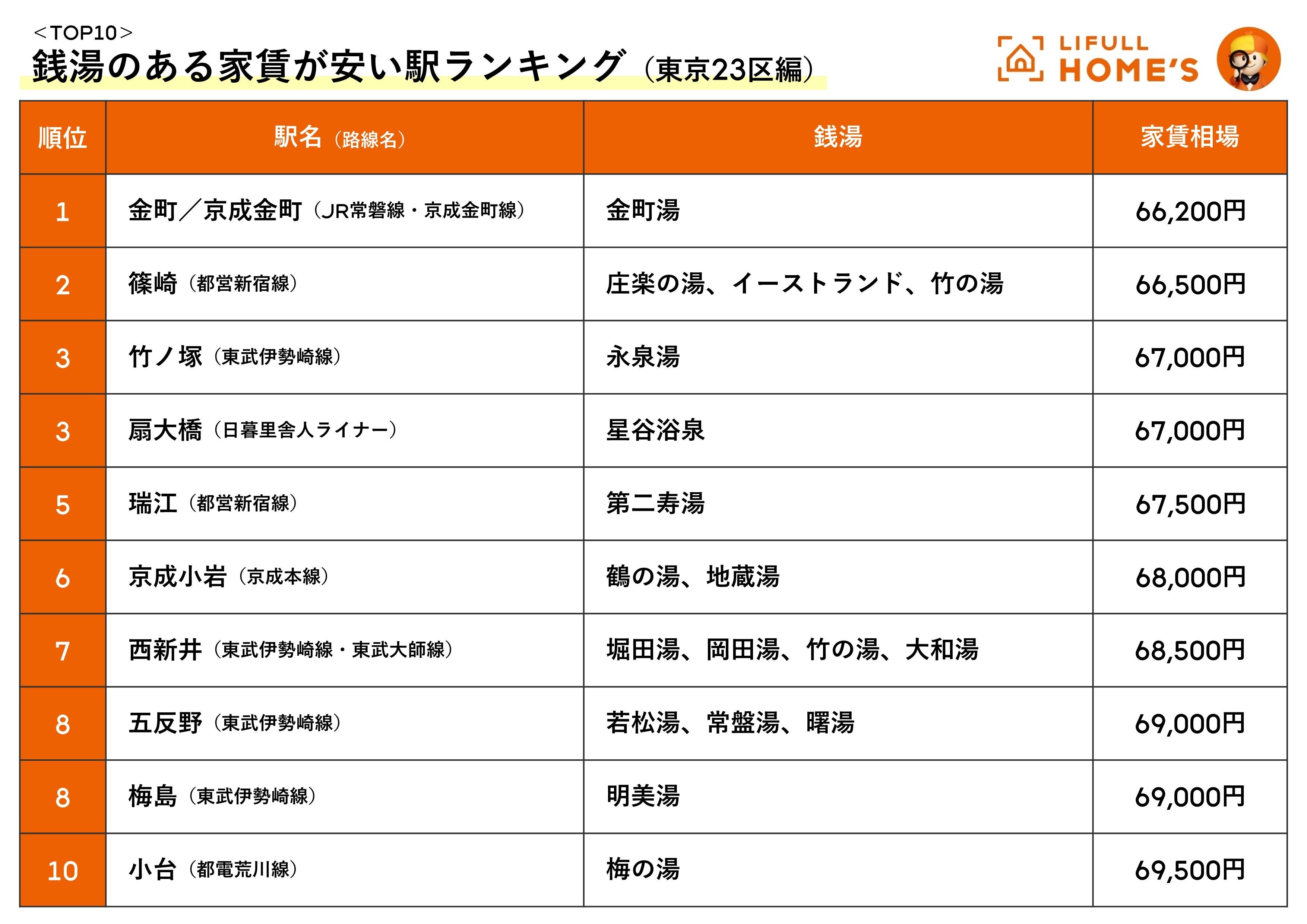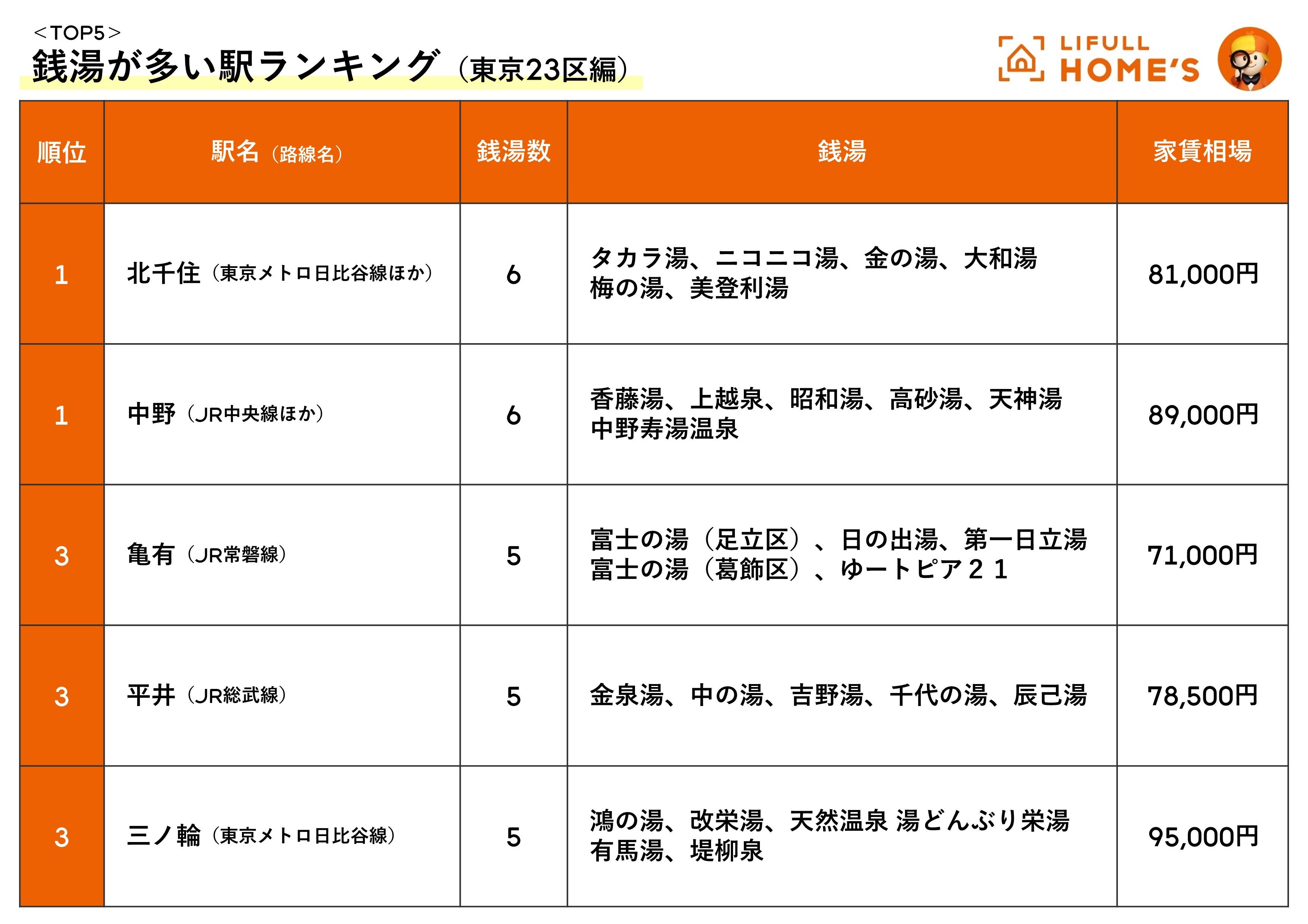 LIFULL HOME'S「銭湯のある家賃が安い駅ランキング(東京23区編)」を発表