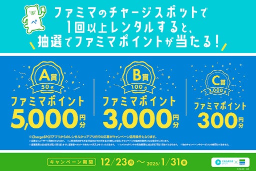 期間中、「ChargeSPOT」アプリからファミリーマートに設置されている「ChargeSPOT」でモバイルバッテリーをレンタルすると、抽選でファミマポイントが当たるキャンペーンです。