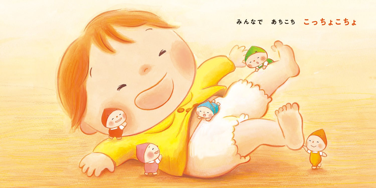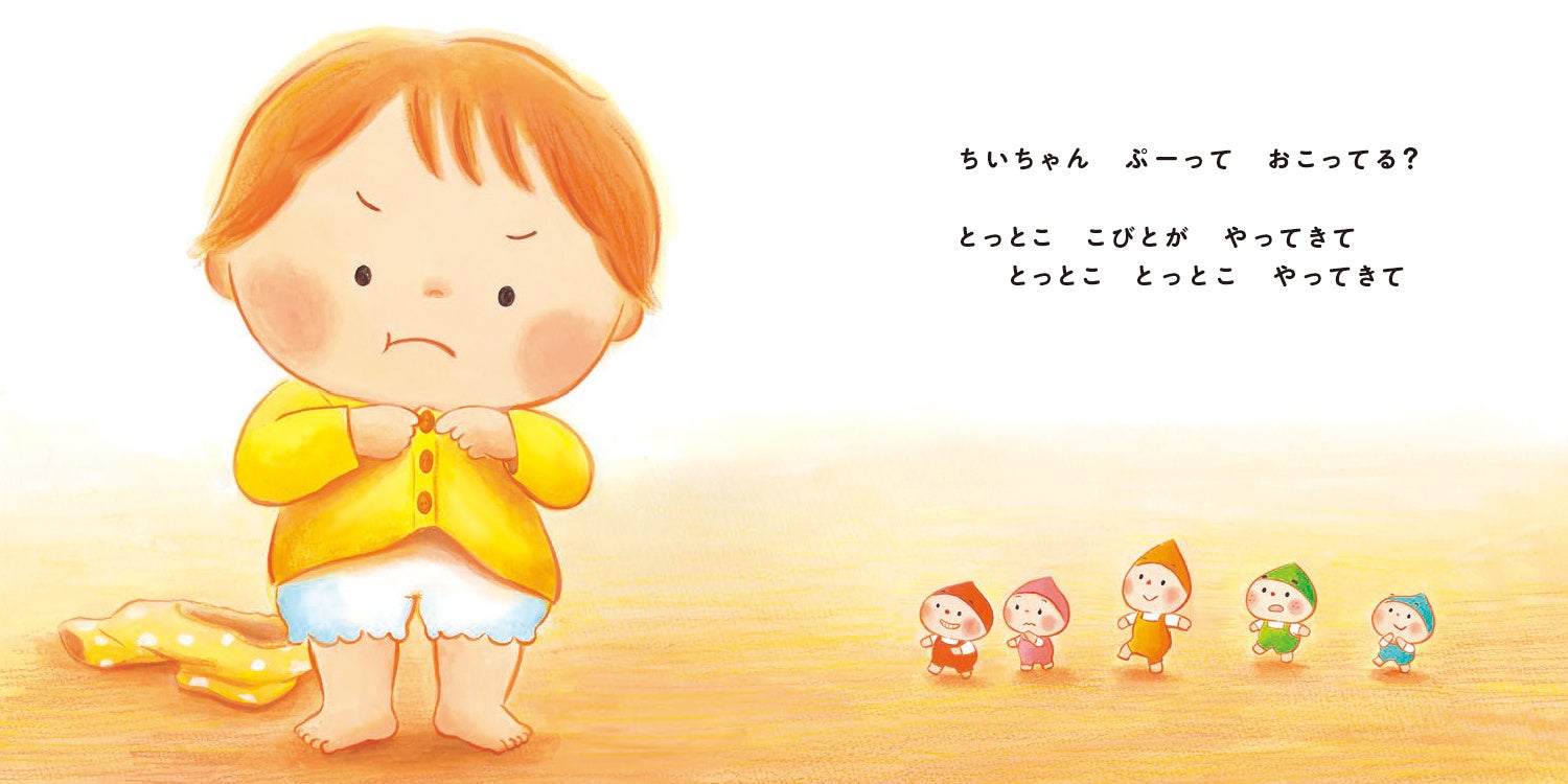 絵本の中でちいちゃんのところに何度もやってくる「とっとこ こびと」。それは、周りにいる大人の指のこびとです。この絵本では、ぬくもりのある指先を優しいこびとに見立てる遊びを取り入れながら、親子でスキンシップを楽しむころができます。