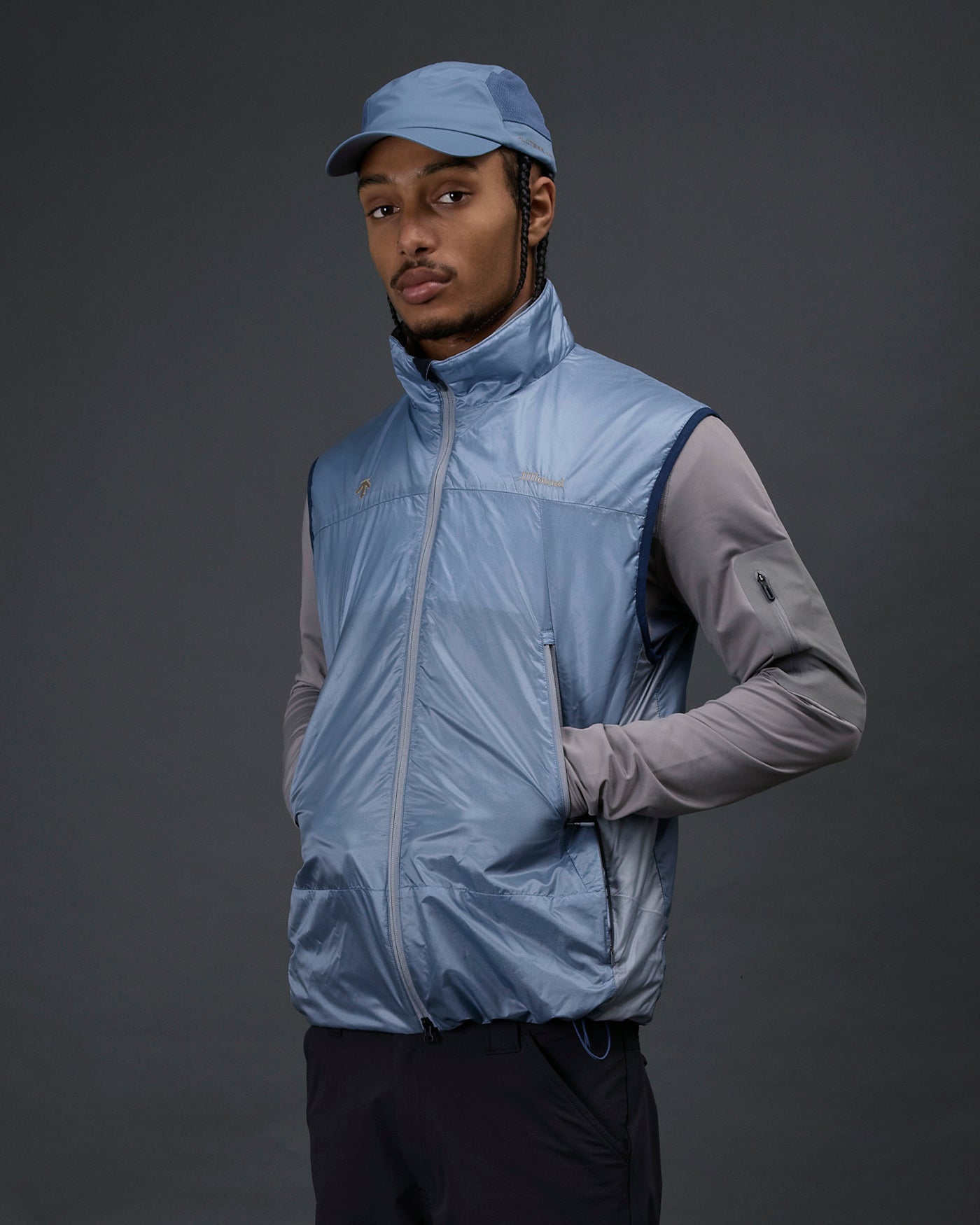 薄手のナイロンリップストップベストや流線型のダウンジャケットなどのセカンダリー・レイヤーは、必要以上のかさばりを抑えながら保温性を提供。アクセサリーはマイクロフリースのグローブ、スキーマスク、ナイロンとメッシュのテープシームキャップなど、多目的に着用できるミニマルなデザインに仕上げ、コレクションを完成させています。