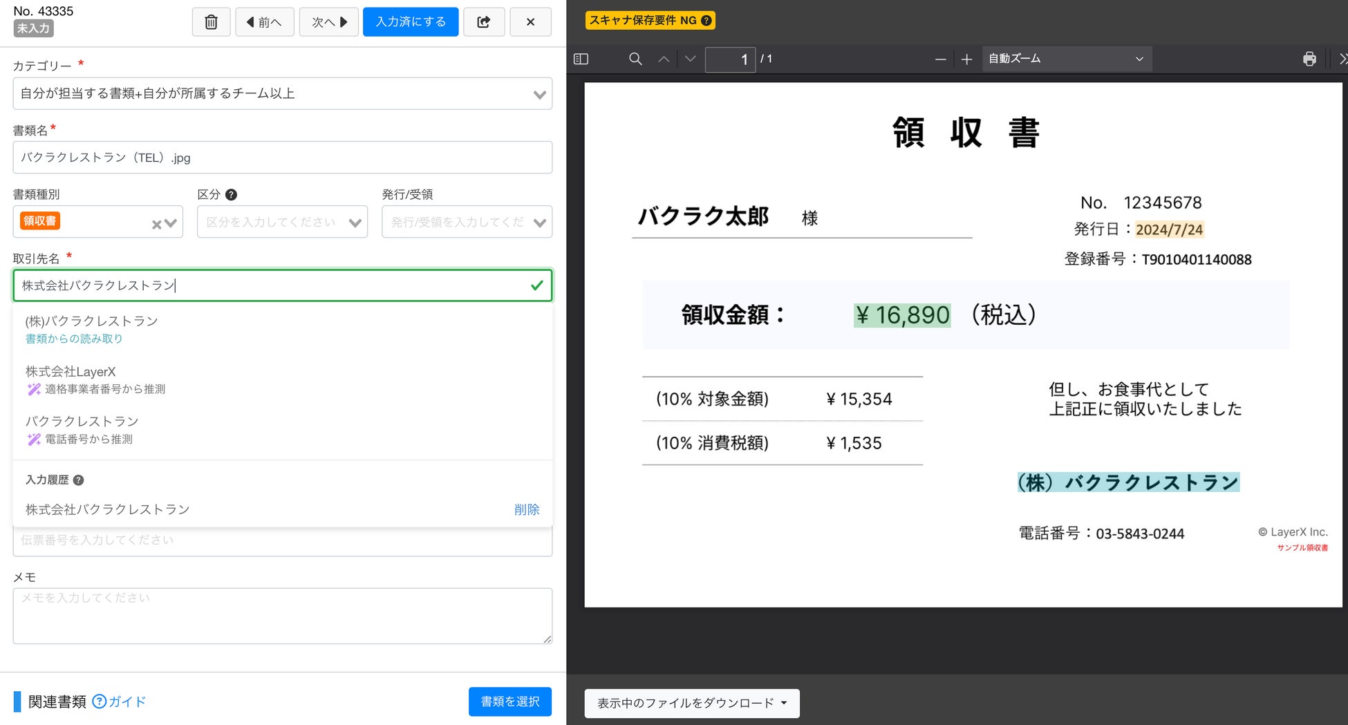適格事業者番号の読み取り情報から国税庁公表の情報を参照し、取引先マスタデータに無い企業名を高精度で入力可能としました。