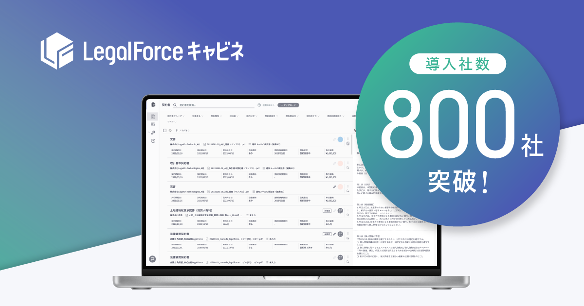 AI契約管理システム「LegalForceキャビネ」導入社数800社突破