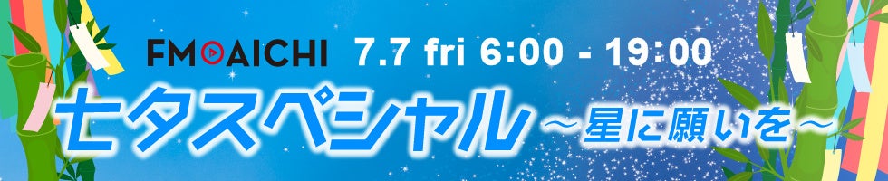 FM AICHIでは、7月7日(金)「FM AICHI 七夕スペシャル ~星に願いを~」を放送します。「星、星空、星座」などをテーマにした楽曲と共に、愛知県内の七夕にまつわるお祭りやトピックス、恋愛成就のスポット、星空観賞ができるスポットやプラネタリウムなどを各生ワイド番組で紹介していきます。Twitterでは、リスナーの皆さんから七夕の情報や「あなたが今かなえたい願い事」を募集し、各生ワイド番組で紹介していきます。