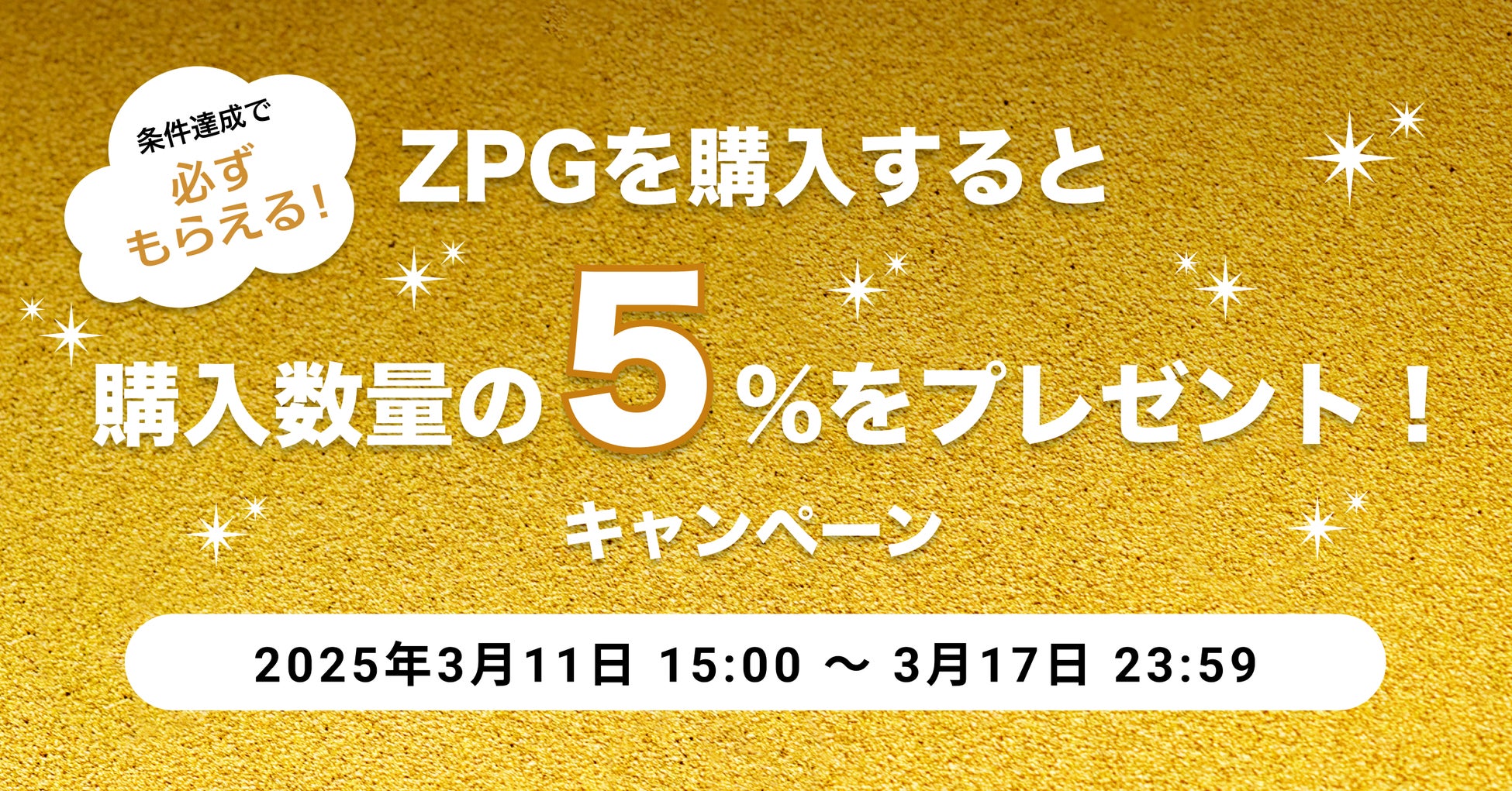 キャンペーン期間中、販売所にてジパングコイン(ZPG)を1,000円以上購入すると、購入数量の5%相当のZPGをプレゼントいたします。