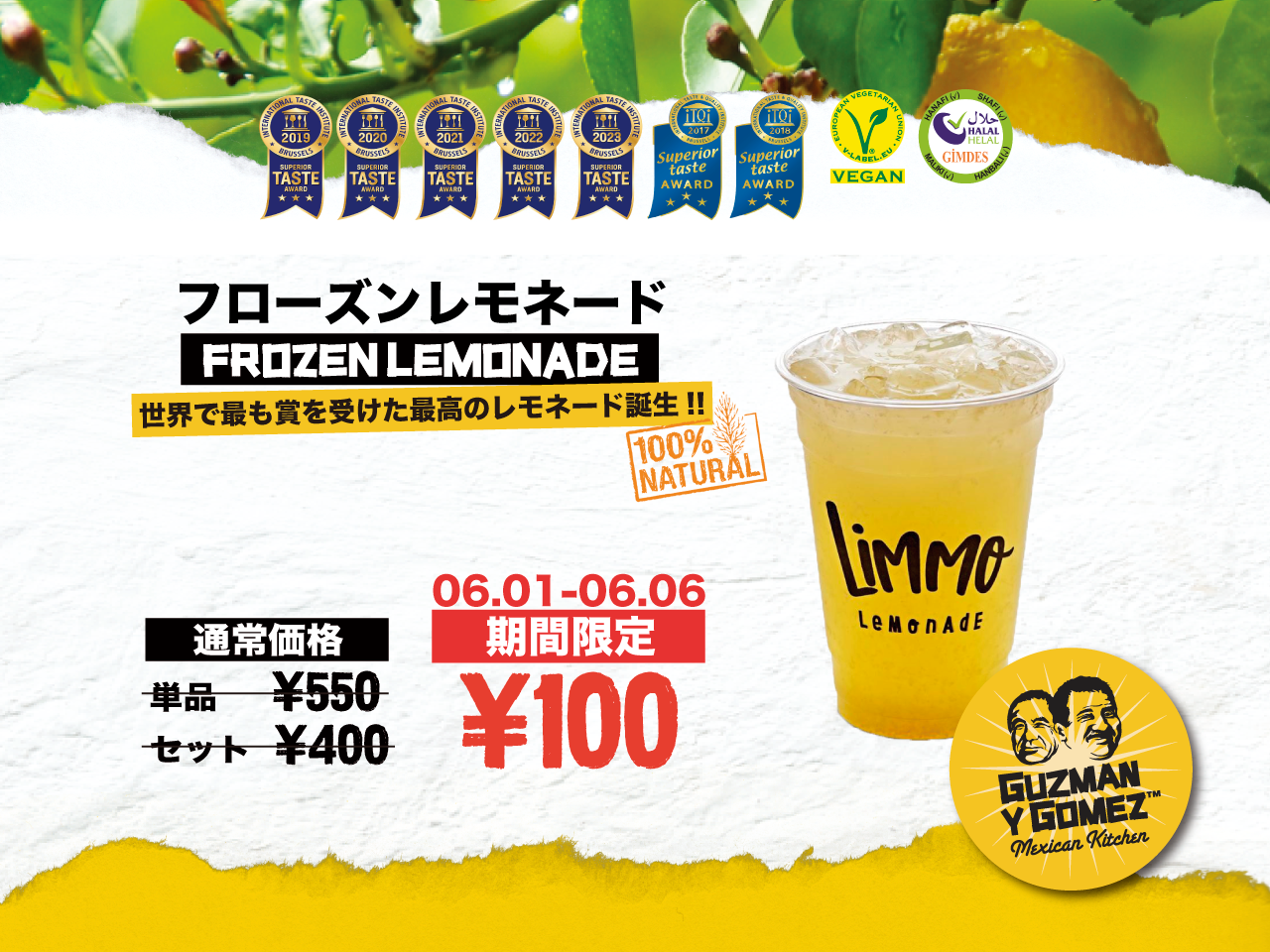 株式会社トランジットメキシカンフードオペレーション(本社:東京都渋谷区、代表取締役 亀山 里樹)が運営するファストカジュアルスタイルのメキシカンキッチン「Guzman y Gomez(グズマン イー ゴメズ、以下GYG)」は、国際味覚審査機構(ITI)で7年連続「優秀味覚大賞」に輝き、2023年には最高栄誉である「ダイヤモンド味覚大賞」を受賞した「LiMMO(リモ)レモネード」を、ひんやり美味しいフローズンスタイルで、2025年6月1日(日)より全店舗にて販売開始いたします。 販売開始を記念し、6月6日(金)までの期間に限り、1杯100円の特別キャンペーンを実施いたします。