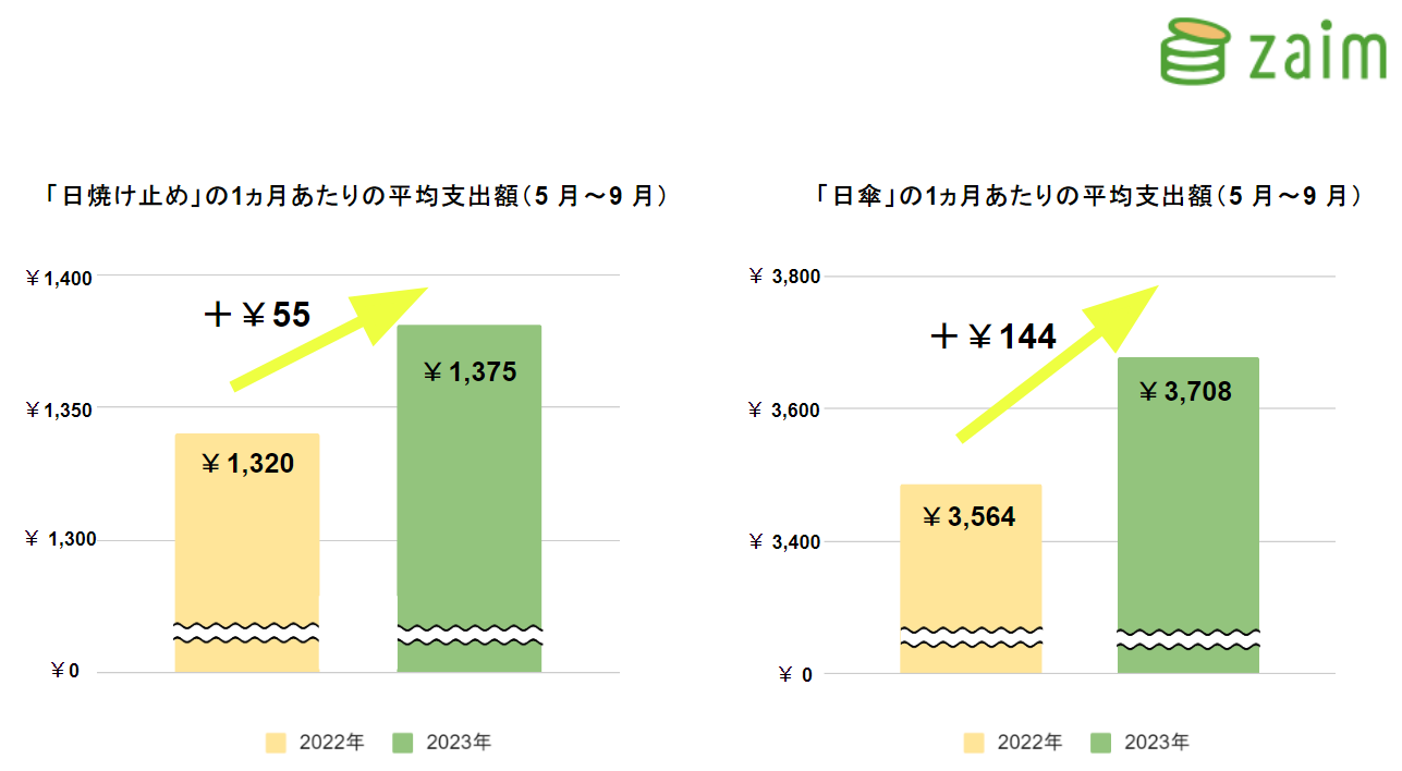 こうした記録的猛暑の中、Zaimの購買データによると、夏の外出時に欠かせない「日焼け止め」と「日傘」の支出が増加。2023 年 5 月~ 9 月における 1 ユーザーあたりの「日焼け止め」と「日傘」の毎月の支出額を見てみると、「日焼け止め」が平均 1,375 円で前年より 55 円上昇。「日傘」が平均 3,708 円で前年より 144 円上昇していました。