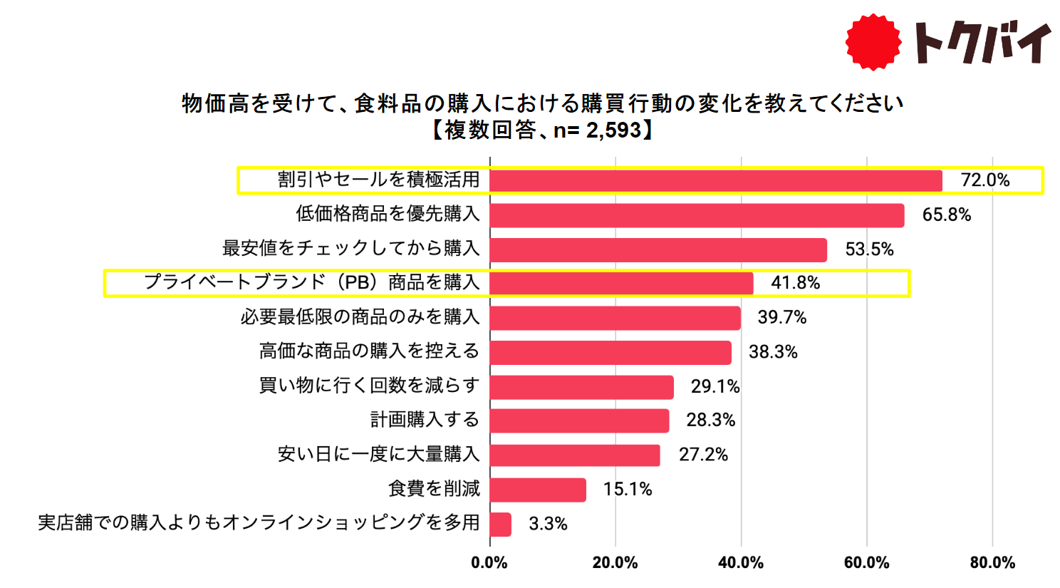トクバイが実施したアンケート調査※でも、物価高を受けた購買行動の変化として 7 割以上が「割引やセールを積極活用」、4 割以上が比較的値段が安い「プライベートブランド(PB)商品を購入」を選択するなど、相次ぐ「値上げラッシュ」は毎日の買い物行動にも変化を与えているようです。
