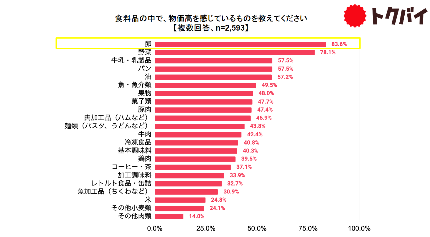トクバイが 2023 年 11 月に発表した調査※では、「物価高を感じている食料品」の 1 位に「卵」が選ばれており、「卵の品切れ」がもたらした「卵」の価格高騰は食料品の値上げラッシュの中でも特に大きな影響を与えていたことが分かりました。