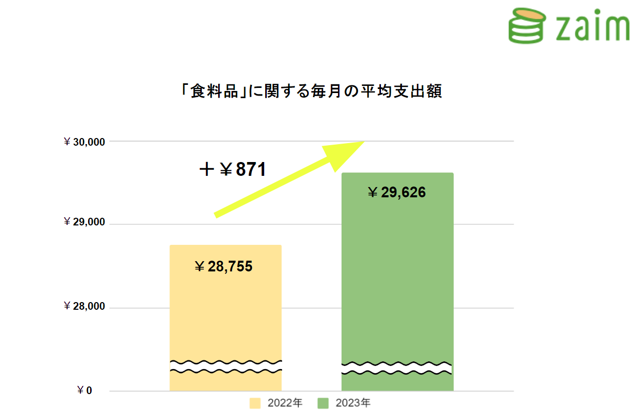 Zaimの購買データによれば、2023 年の「食料品」に関する毎月の支出金額は平均 29,626 円となっており、前年の平均 28,755 円より 871 円も上昇していることも明らかになりました。