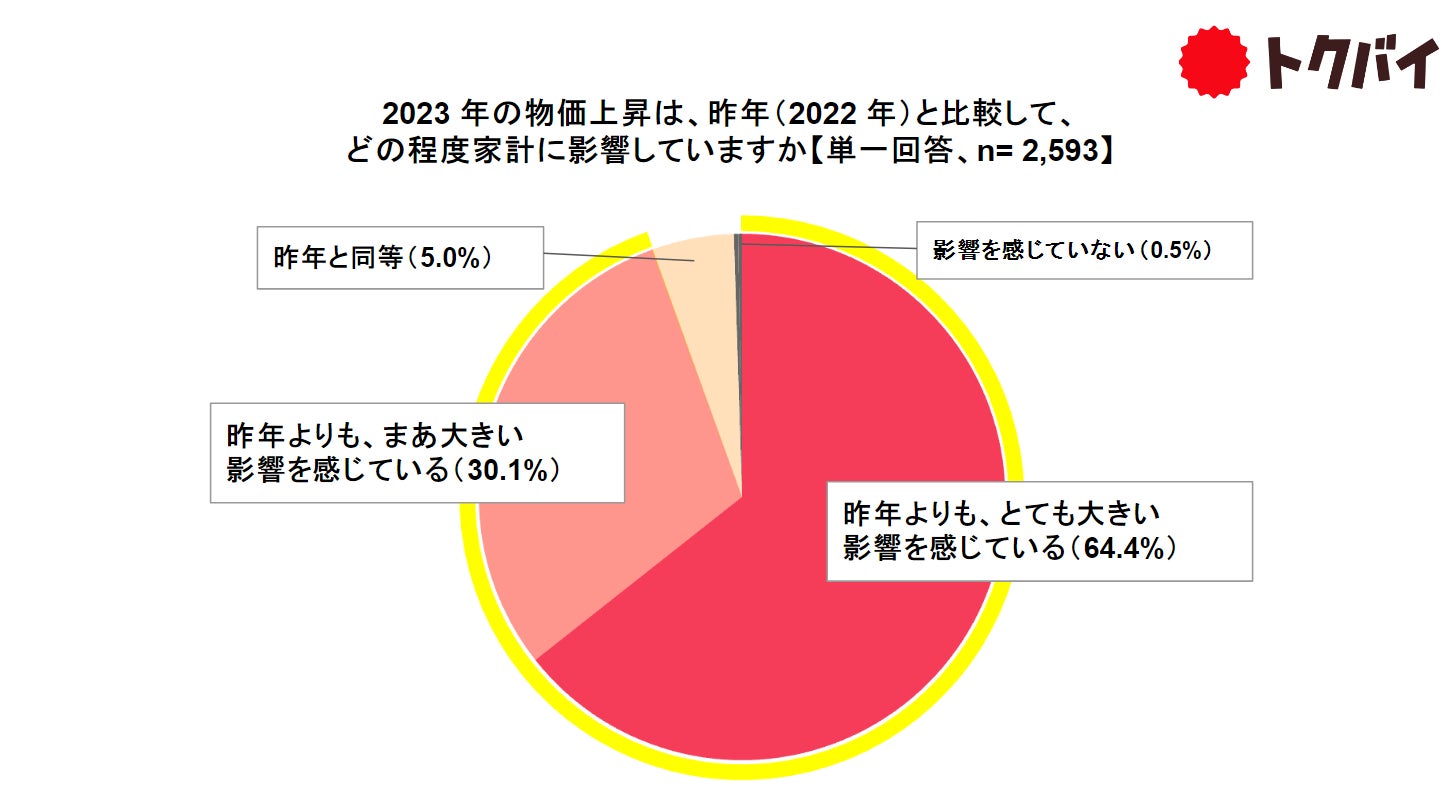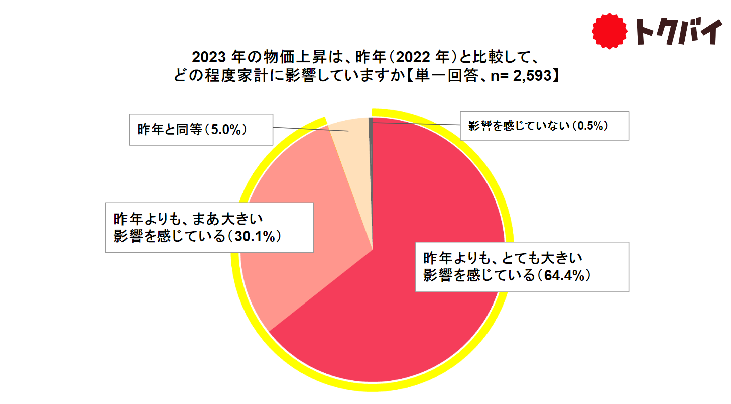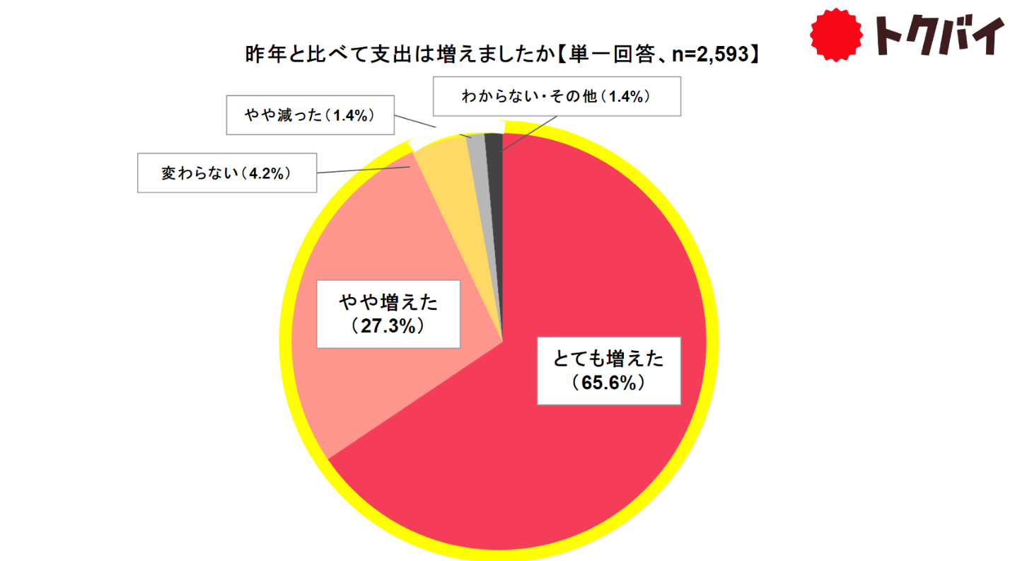 2023 年 11 月にトクバイが実施した物価高に関するアンケート調査※では、9 割以上が「昨年よりも家計への影響が大きいと感じる」と回答。また「昨年と比べて支出が増えたか」という質問に対しても 9 割以上が「増えた」と回答するなど、物価高による生活への影響を多くの人が実感する中、「支出の増加」という形で家計にも数字として表れていることが判明しました。