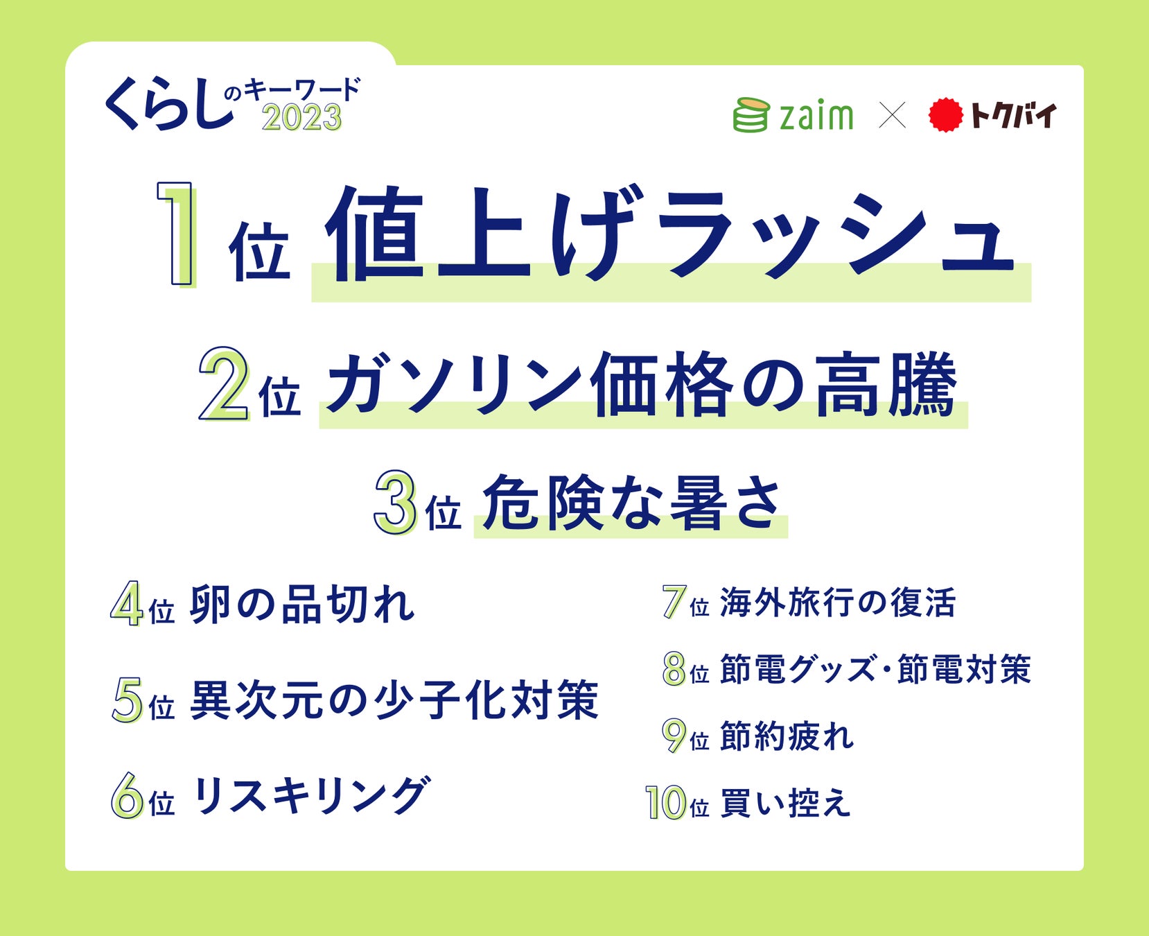 【Zaim×トクバイ調査】生活者 1 万人が選んだ「くらしのキーワード 2023」を発表!今年、日常生活に最も影響を与えたのは「値上げラッシュ」