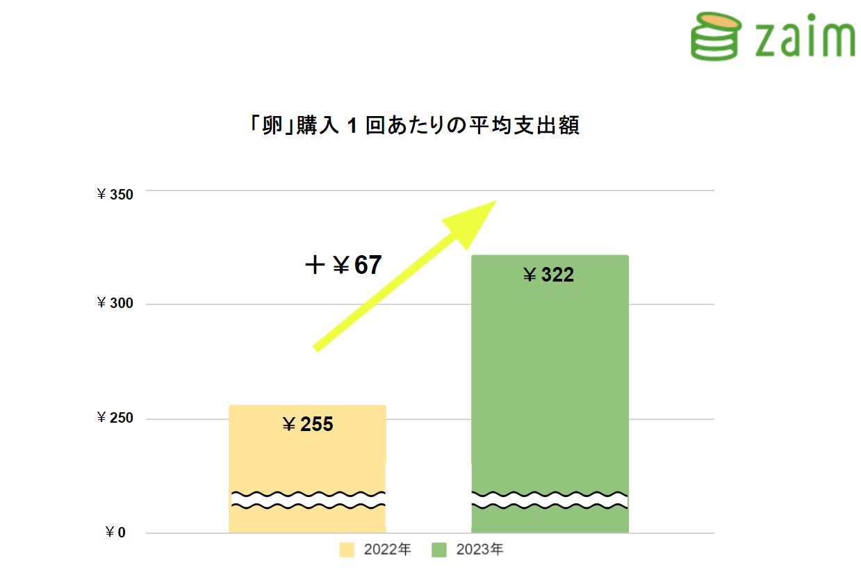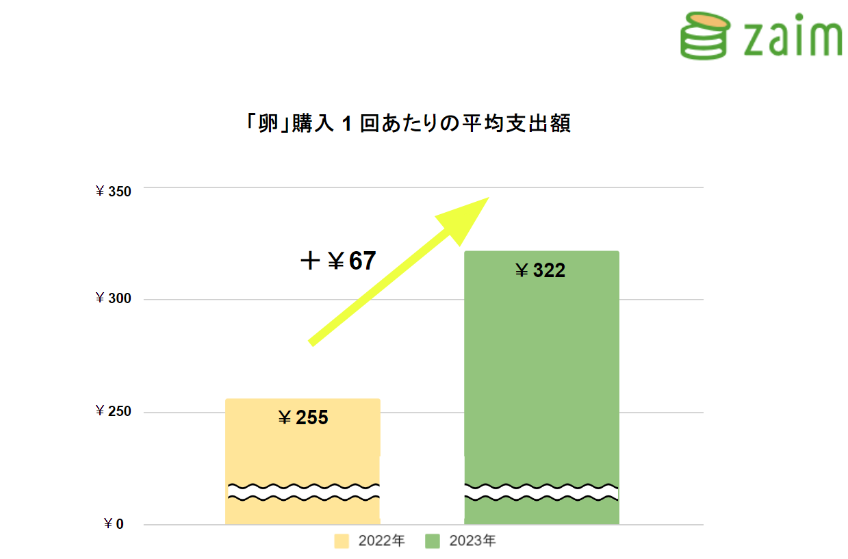 また「卵 1 パック 300 円超えはビックリ」「1 パック 100 円で買えていた時代もあったのに・・・悲しい」といった意見も多く、実際にZaimの購買データを見てみると、2023 年の「卵」の購入 1 回あたりの支出額は平均 322 円で、前年より 67 円、率にして 26 %上昇していたことが分かりました。