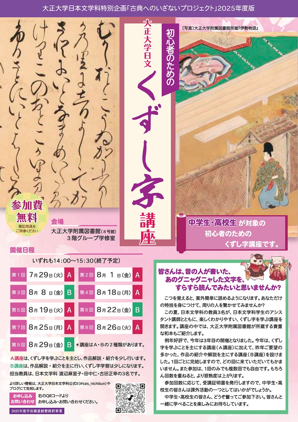 大正大学(学長:神達知純、所在地:東京都豊島区)では、2025年7月から8月の計9回で、中学生および高校生を対象としたイベント「初心者のための大正大学日文くずし字講座」を開講します(主催:本学文学部日本文学科)。