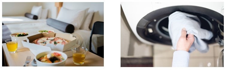 - 客室には洗濯乾燥機と電子レンジ、アジョイニングルームにはミニキッチンを設置